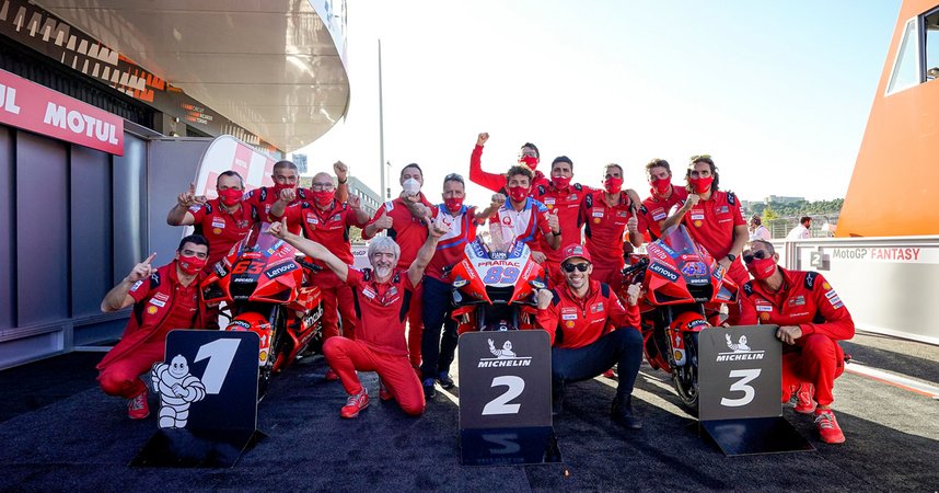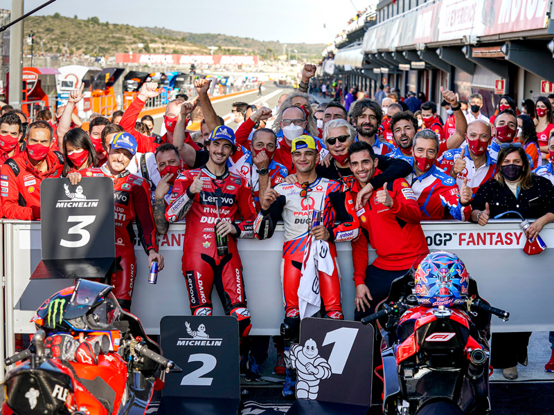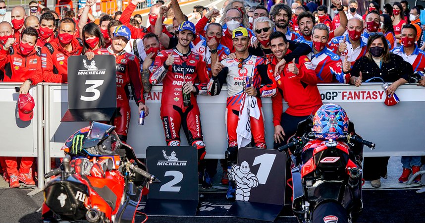 Mit Francesco "Pecco" Bagnaia, Jorge Martin und Jack Miller fuhren erstmals drei Ducati Piloten auf das Podium der Königsklasse. Mit diesem epochalen Triumph beim finalen Grand Prix des Jahres in Valencia, wurde auch der Sieg für Ducati Lenovo in der Teamwertung sichergestellt. In der Herstellerwertung hatte sich Ducati bereits ein Rennen vor Schluss gegen die Konkurrenz durchgesetzt.