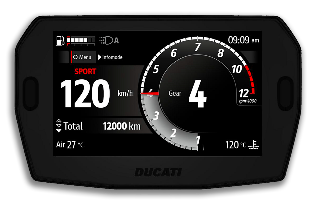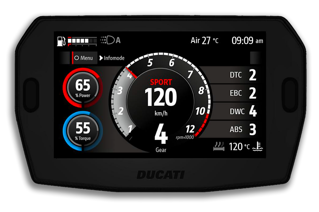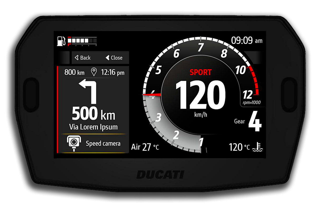 Die Funktionen des Elektronikpakets der neuesten Generation, dessen Bedienelemente und Funktionen von denen der Panigale V4 abgeleitet sind, werden über ein 5"-TFT-Dashboard im Format 16:9 angezeigt und über einen "Petal"-Joystick gesteuert. Um die Klarheit und Eleganz des neuen Dashboards zu unterstreichen, wurden die Warnleuchten – mit Ausnahme der roten LED-Überdrehzahlanzeige – von der Außenmaske entfernt und ins Innere des Dashboards verlegt. Der Drehzahlmesser und die Ganganzeige blinken und werden grün, um den empfohlenen Gangwechsel anzuzeigen, und rot, um den Eingriff des Drehzahlbegrenzers zu signalisieren. Während des Einfahrens leuchtet der Drehzahlmesser orange, wenn die empfohlene Drehzahl überschritten wird. Das Dashboard verfügt über zwei Anzeigemodi namens Road und Road Pro, die sich durch die Art der angezeigten Informationen und die grafische Darstellung unterscheiden. Alle Modi haben eine automatische Umschaltung zwischen Tag- und Nachtbeleuchtung. Mit dem "Joystick" am Lenker kann man während der Fahrt direkt zwischen den verschiedenen Info-Modi wechseln. Das Dashboard ermöglicht auch die Bluetooth-Kopplung mit einem Smartphone und einem Kommunikationssystem im Helm, um Musik abzuspielen, Anrufe entgegenzunehmen und die Anweisungen des Turn-by-Turn-Navigationsgeräts zu hören, sofern es installiert ist.