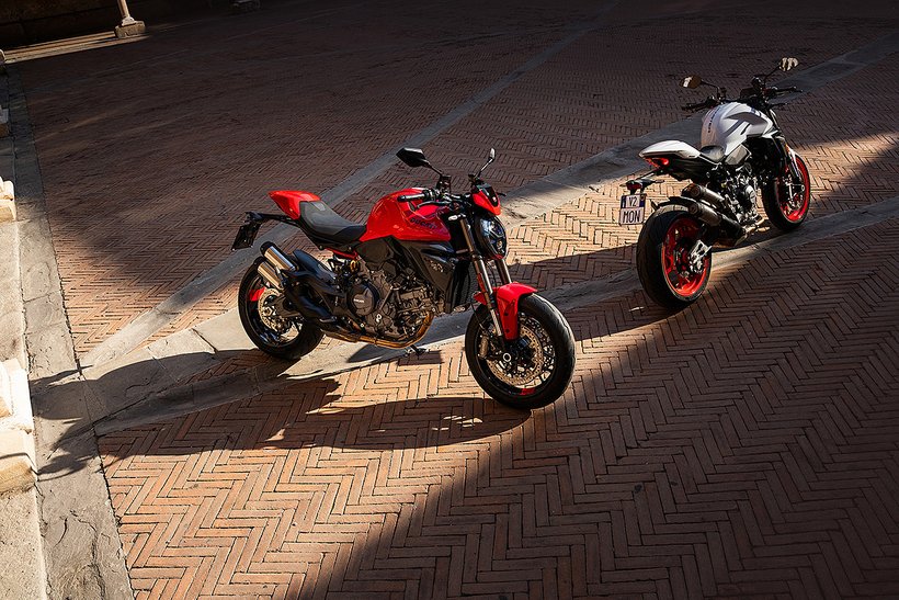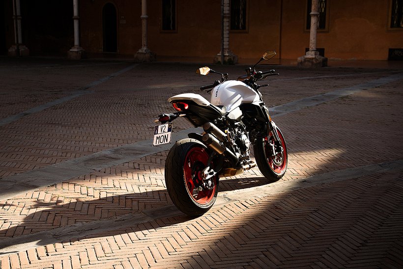 Auch bei der Monster kommt wie bei Panigale und Streetfighter V2 eine Monocoque-Struktur zum Einsatz. Dieser Rahmentyp besteht aus einem nur 4 kg schweren Aluminium-Monocoque, das…