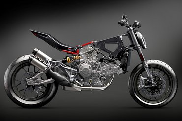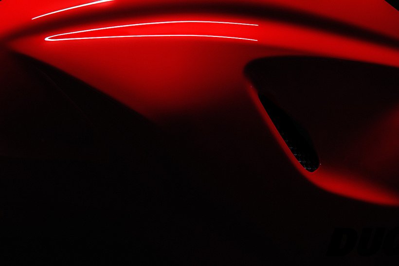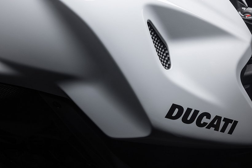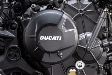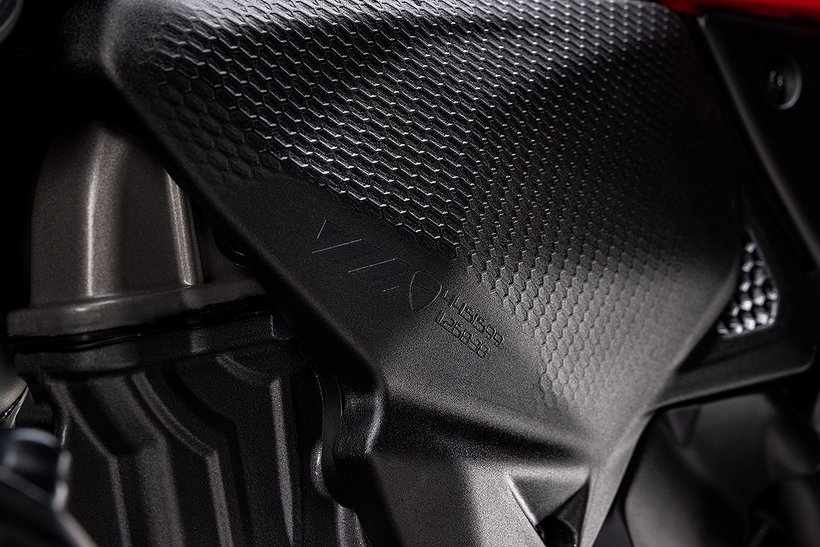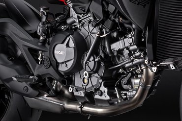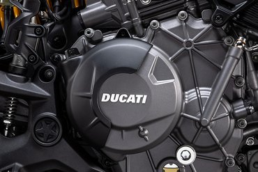 Das 90°-V2-Layout ermöglicht den Bau eines schlanken, charakterstarken Motors mit exzellentem Sound und kraftvoller Leistungsentfaltung – ganz in bester Ducati-Tradition. Der 90°-Zylinderwinkel sorgt zudem für einen natürlichen Massenausgleich der Kräfte erster Ordnung, weshalb keine Ausgleichswelle zur Reduzierung von Vibrationen notwendig ist. Um die Gewichtsverteilung weiter zu optimieren, wurden die Zylinder um 20° nach hinten geneigt, ausgehend vom horizontalen Zylinder. Dieser Motor garantiert exzellentes Handling und sorgt so für maximalen Fahrspaß.