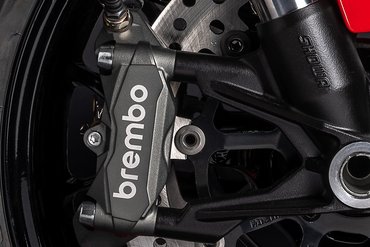 Das Brembo-Bremssystem garantiert eine hohe Bremsleistung bei gleichzeitiger höchster Präzision und Dosierbarkeit am Bremshebel sowie eine große Linearität zwischen der aufgebrachten Bremskraft und der Bremsperformance. Vorne verrichten Brembo M4.32-Monoblock-Bremssättel mit jeweils vier 32-mm-Kolben auf zwei 320-mm-Bremsscheiben ihren Dienst. Die Bremssättel sind in Monoblock-Bauweise, also aus einem Teil gefertigt, was für ein Höchstmaß an Steifigkeit und Formstabilität sorgt und der Bremspräzision sowie Performance zugutekommt. Bremsbeläge aus einer speziell ausgewählten Mischung reduzieren den „Anfangsbiss“ und verbessern so die Dosierbarkeit, besonders im Stadtverkehr. Das vordere Bremssystem wird von einer Brembo PR18/21-Radialpumpe gesteuert, die ein hohes Gefühl mit einer Bremsleistung verbindet, die in diesem Segment Maßstäbe setzt. Hinten verzögert eine 245-mm-Bremsscheibe mit einer Brembo 2-Kolben-Bremszange.