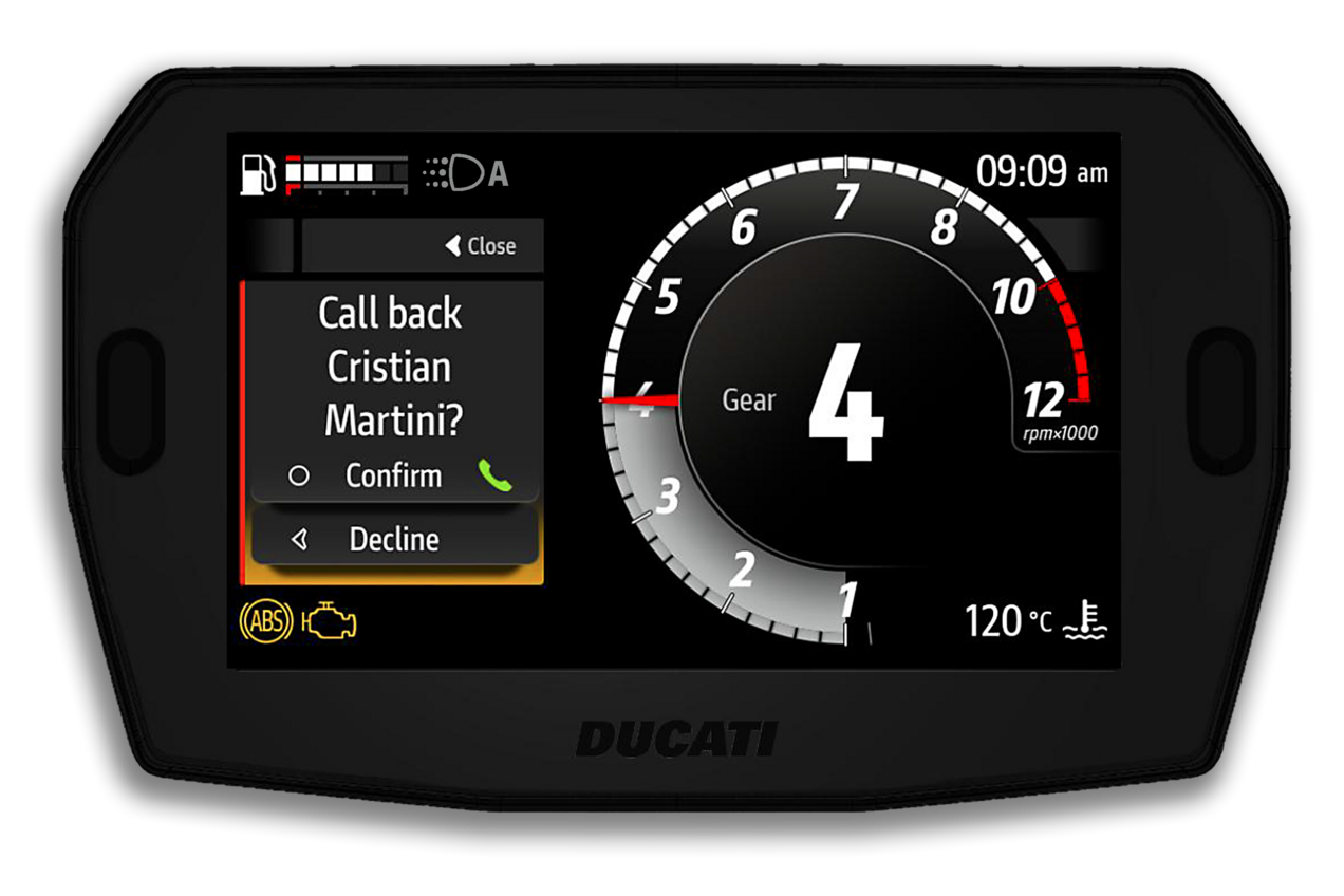 Die Vielseitigkeit dieses Modells zeigt sich auch darin, dass es für das Ducati Multimedia System (DMS) vorbereitet ist. Sobald das DMS aktiviert wurde, verbindet sich das Motorrad automatisch über Bluetooth mit dem Smartphone und ermöglicht die Steuerung der wichtigsten Multimediafunktionen, sobald der Fahrer aufsteigt. Das Dashboard zeigt Informationen wie abgespielte Musik, neue Textnachrichten oder den Namen des Anrufers an. Telefonanrufe und Musik können über das Freisprechsystem im Helm empfangen und gehört werden.