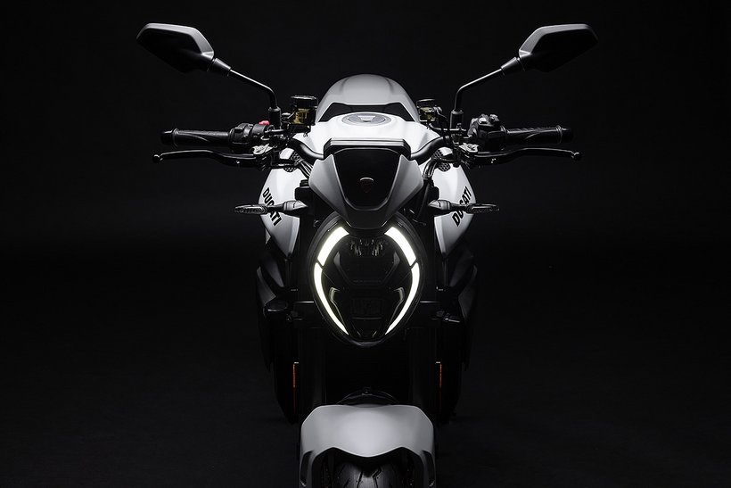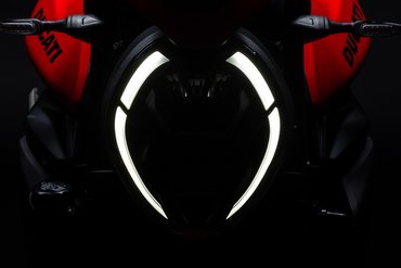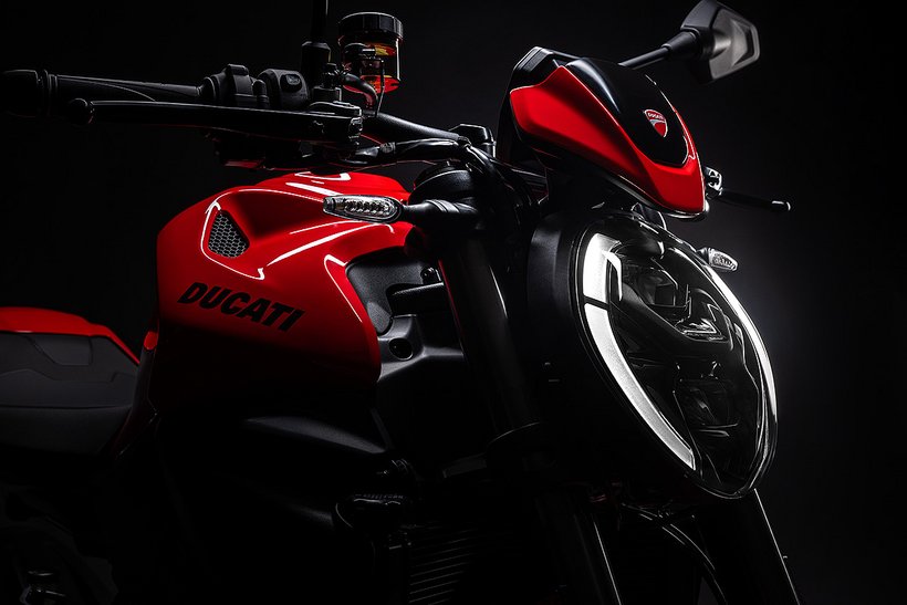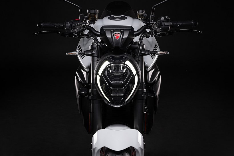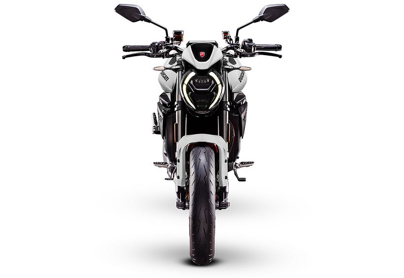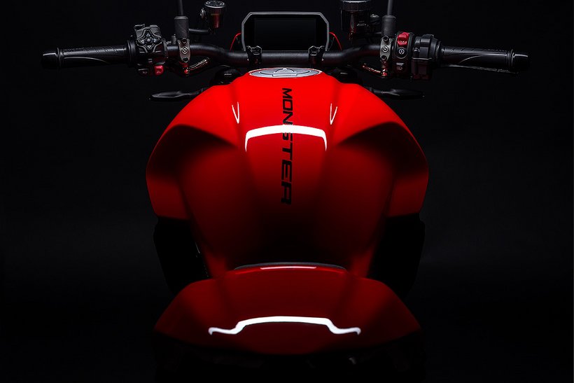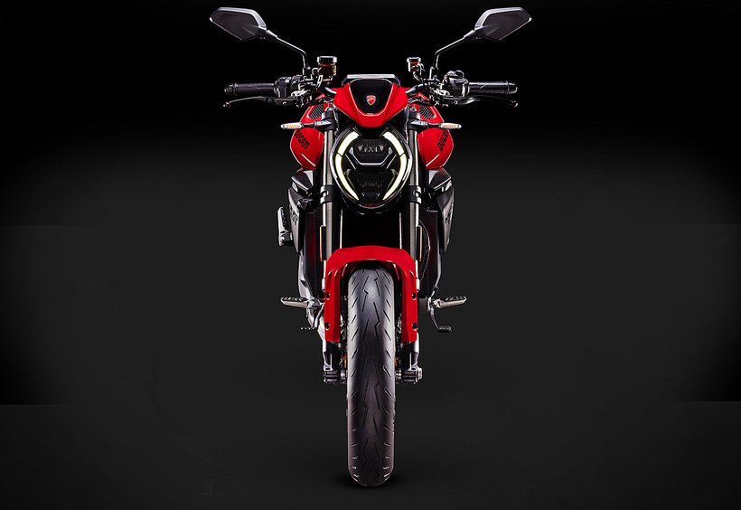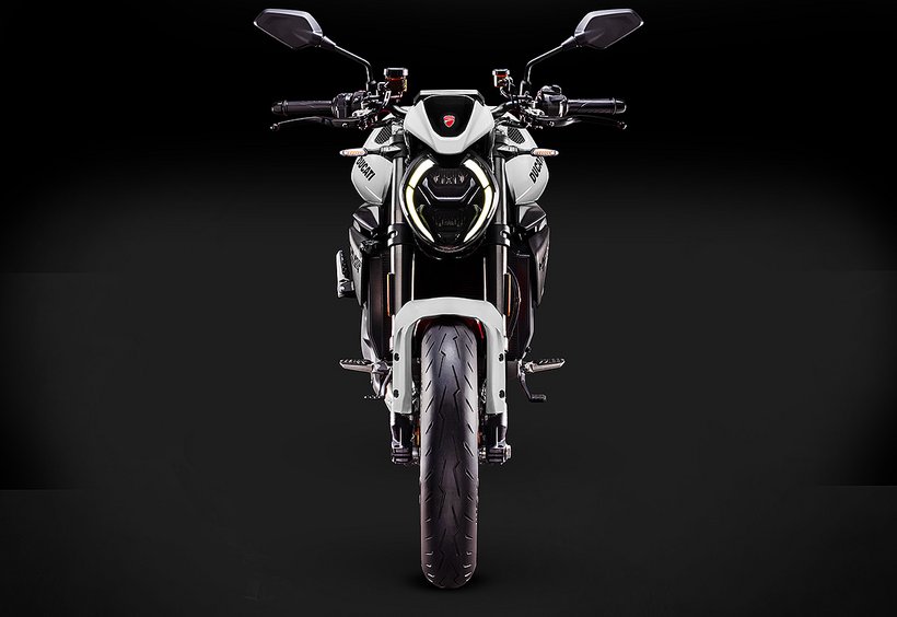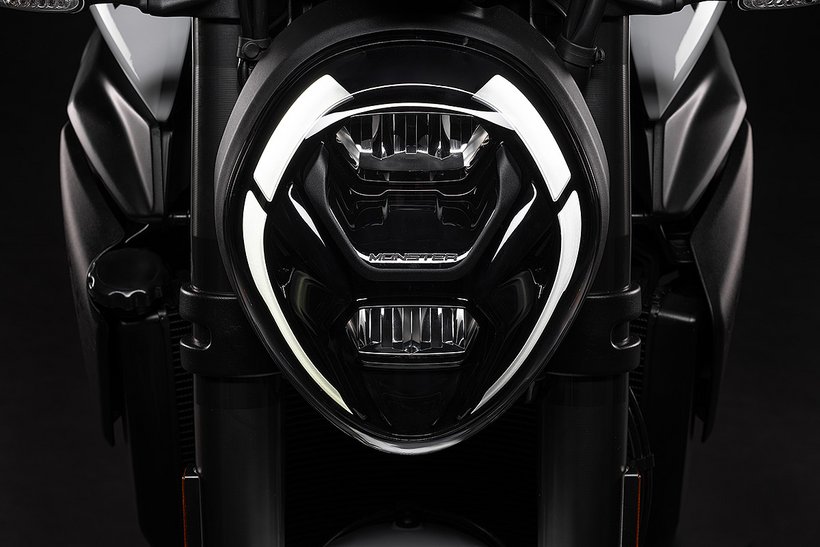 Der Scheinwerfer, der im Motorraddesign das wahre Gesicht des Motorrads ist, ist vollständig in LED-Technik ausgeführt, wirkt roboterhaft und modern und ist extrem kompakt, um die Frontpartie kurz zu halten und „zwischen den Schultern“ des Kraftstofftanks „versenkt“ zu sein. Letzterer ist ein entscheidendes Designelement, seit jeher das markanteste Merkmal der Monster.