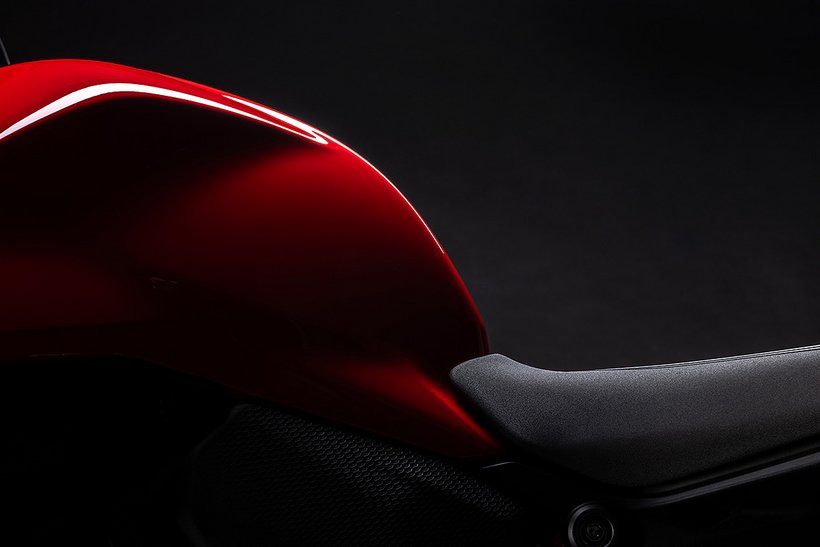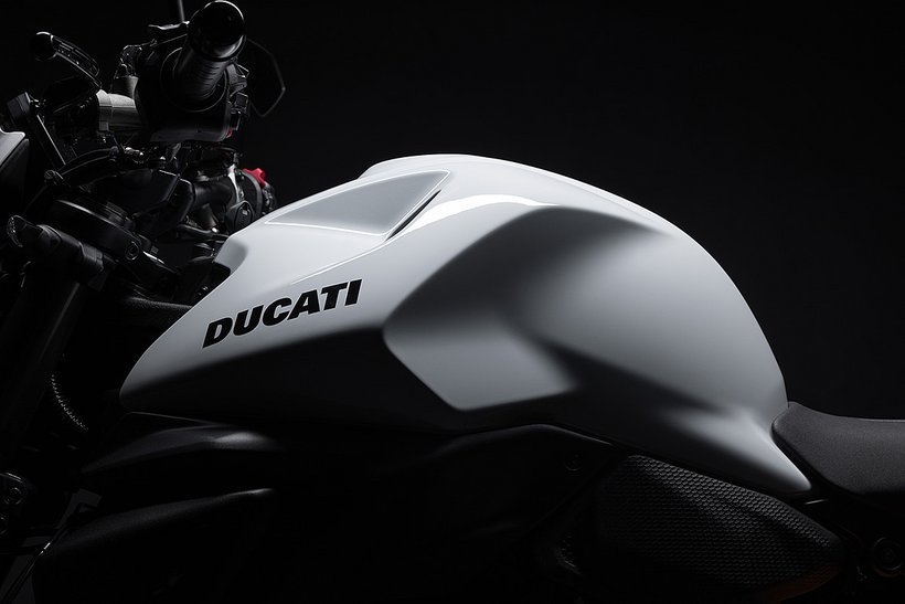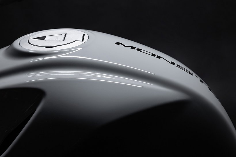 Der Kraftstofftank vereint ein äußerst zeitgemäßes Design mit Inspirationen der legendären Monster-Modelle der Vergangenheit, wie beispielsweise den Lufteinlässen an der Front, die eine doppelte Funktion erfüllen: Sie kühlen das Innere des Tanks und vergrößern den Lenkwinkel, während der muskulöse „Buckeltank“ dem Erscheinungsbild entspricht, das die Monster seit jeher auszeichnet.