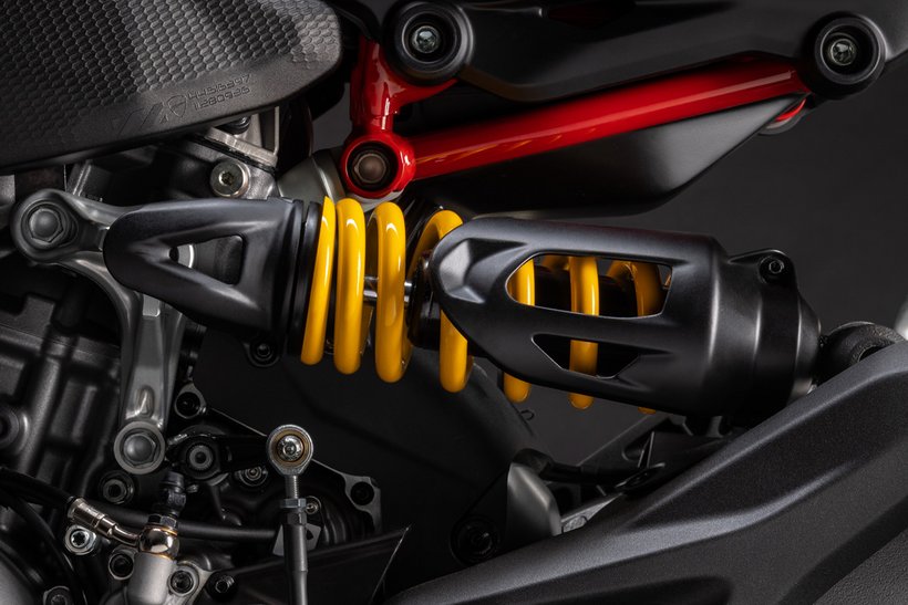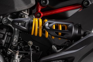 Die 43-mm-Upside-Down-Gabel und das Monofederbein, beide von Showa, wurden speziell kalibriert, um den Komfort im Alltag und die Sportlichkeit auf gemischten Straßen zu optimieren, was den Dual-Charakter der Ducati Monster unterstreicht. Die Monster ist somit stabiler und vermittelt dem Fahrer mehr Sicherheit, bleibt dabei aber wendig und macht Spaß. Das Federbein ist seitlich montiert und direkt an der neuen Zweiarmschwinge befestigt, wodurch sich die Einstellung der Federvorspannung erleichtert.