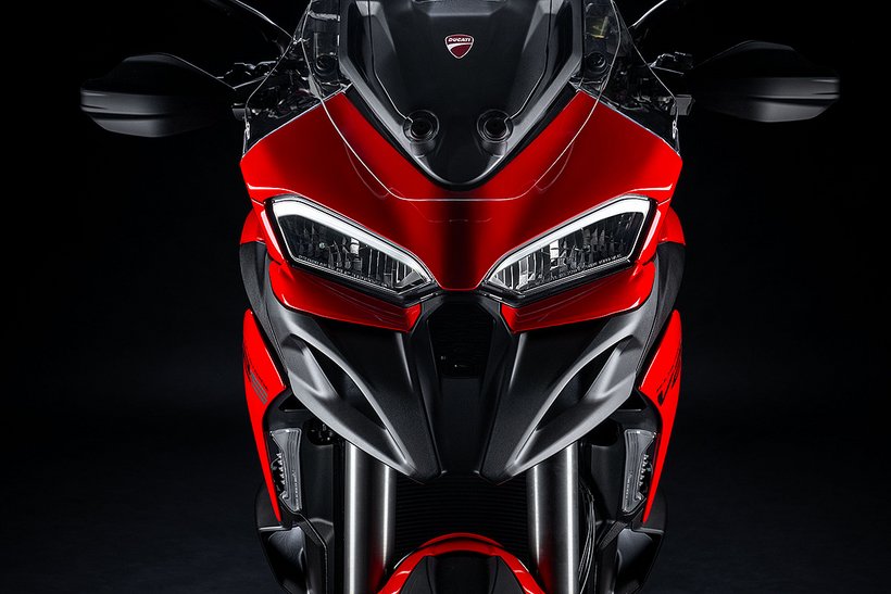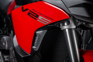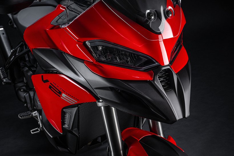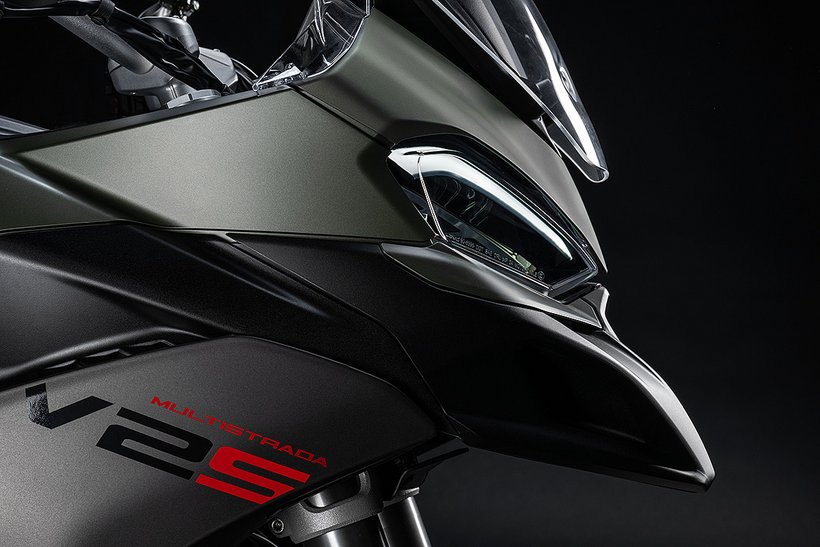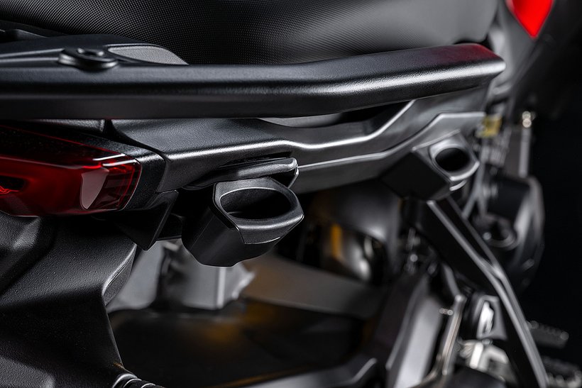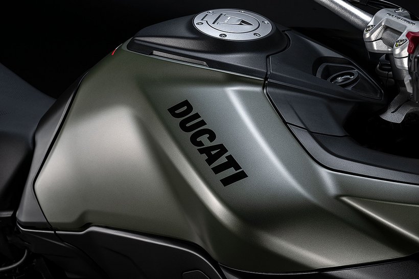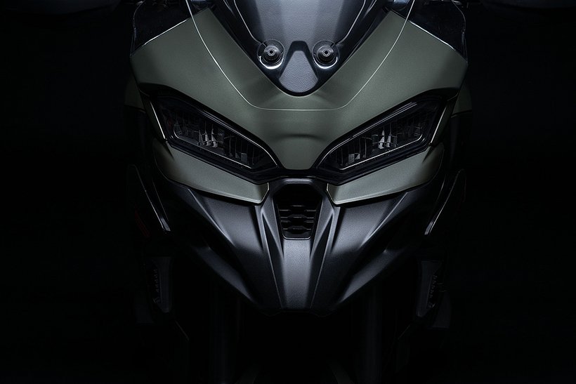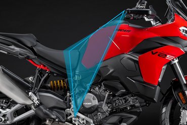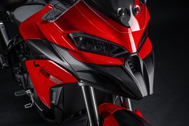 Der neue Scheinwerfer mit seinem Tagfahrlicht, inspiriert von Panigale und Multistrada V4, verleihen der Frontansicht eine kompakte, aggressive Optik, die sofort ins Auge fällt. Der kürzere Schnabel fügt sich nahtlos in das Design der Frontpartie ein, während die filigranen Blinker neu gestaltet und perfekt in die Seitenverkleidungen integriert wurden. Sie bieten nicht nur hervorragende Sichtbarkeit, sondern schaffen auch einen Luftspalt zur Verkleidung, durch den Frischluft zum Fahrer geleitet wird.