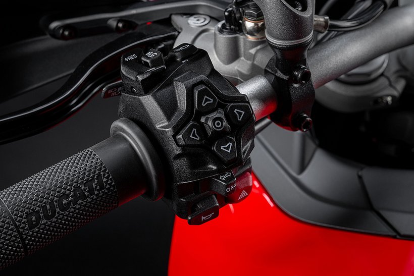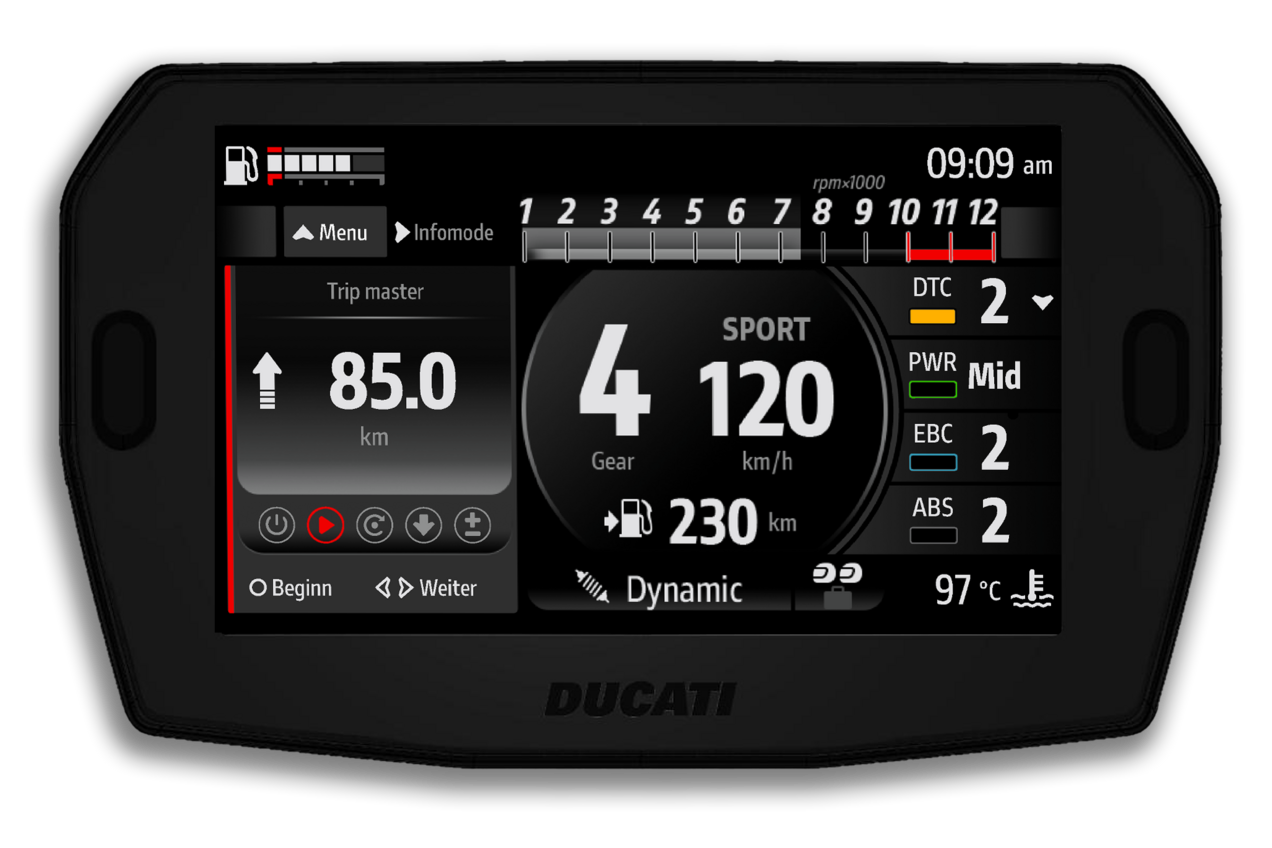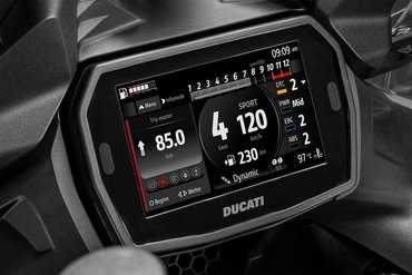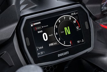 Die Funktionen des Elektronikpakets der neuesten Generation, dessen Bedienelemente und Funktionen von denen der Panigale V4 abgeleitet sind, werden über ein 5"-TFT-Dashboard im Format 16:9 angezeigt und über einen “Petal”-Joystick gesteuert. Um die Übersichtlichkeit und Eleganz des neuen Dashboards zu unterstreichen, wurden die Warnleuchten mit Ausnahme der roten LED-Überdrehzahlanzeige von der Außenmaske entfernt und ins Innere des Dashboards verlegt. Der Drehzahlmesser und die Ganganzeige blinken und werden grün, um den empfohlenen Gangwechsels anzuzeigen, und rot, um den Eingriff des Drehzahlbegrenzers zu signalisieren. Während des Einfahrens leuchtet der Drehzahlmesser orange, wenn die empfohlene Drehzahl überschritten wird. Das Dashboard verfügt über drei Anzeigemodi namens Road, Road Pro und Rally, alle mit automatischer Umschaltung zwischen Tag- und Nachtbeleuchtung, die sich durch die Art der angezeigten Informationen und die grafische Darstellung unterscheiden. Mit dem „Joystick“ am Lenker kann man während der Fahrt direkt zwischen den verschiedenen Info-Modi wechseln. Das Dashboard ermöglicht auch die Bluetooth-Kopplung mit einem Smartphone und einem Kommunikationssystem am Helm, um Musik abzuspielen, Anrufe entgegenzunehmen und die Anweisungen des Turn-by-Turn-Navigationsgeräts zu hören, sofern diese Systeme installiert wurden.