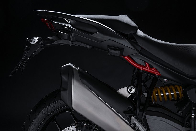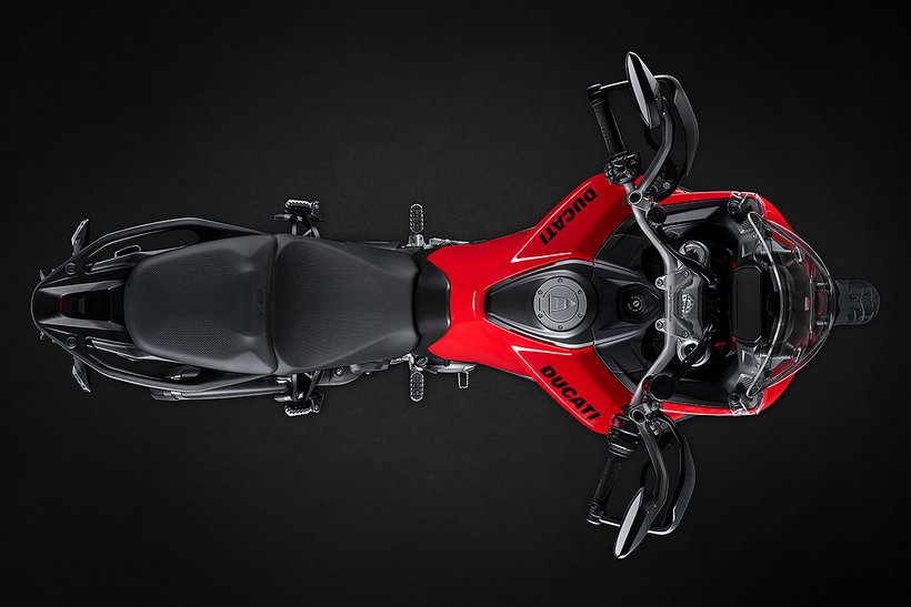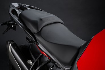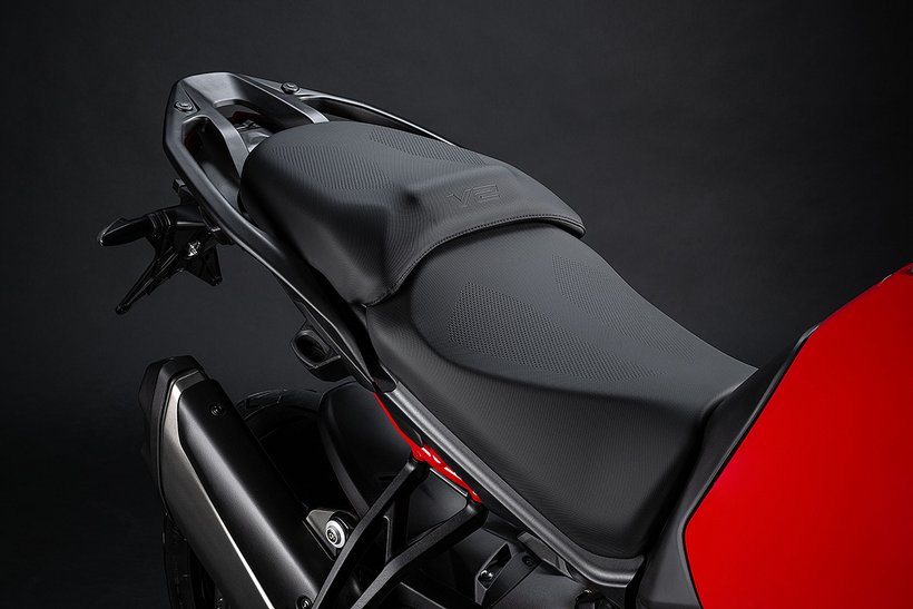Die Ergonomie der Multistrada V2 wurde mit dem Ziel maximalem Komfort zu erreichen komplett überarbeitet. Die Sitzbank für Fahrer und Beifahrer wurde neu gestaltet und dabei wurde der Höhenunterschied zwischen Fahrer und Beifahrer reduziert. Das Topcase und die Seitenkoffer wurden nach hinten versetzt, um des Platzangebot für den Beifahrer zu verbessern. Zudem wurde das ergonomische Dreieck aus Lenker, Sitzbank und Fußrasten optimiert.