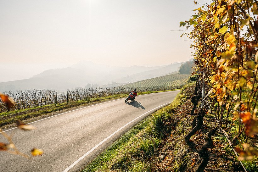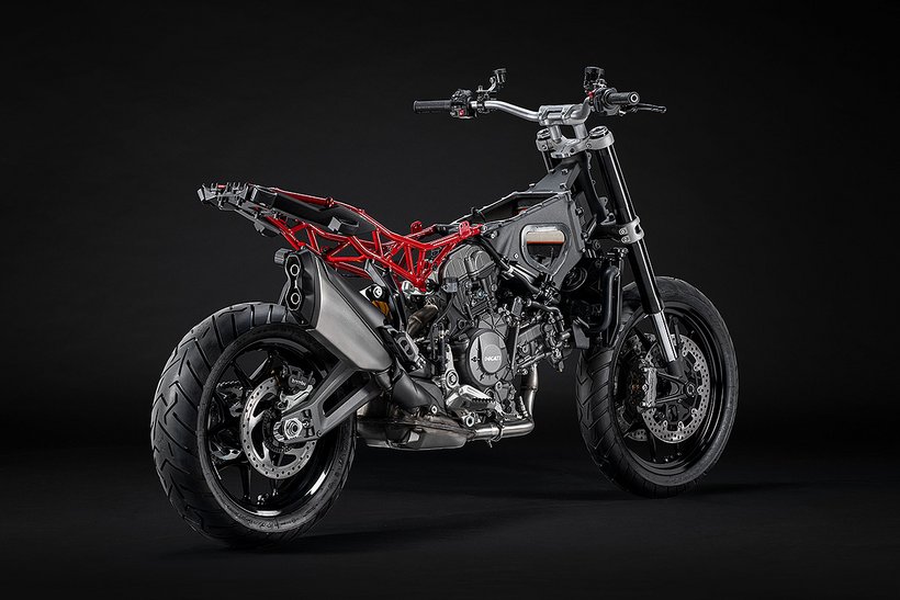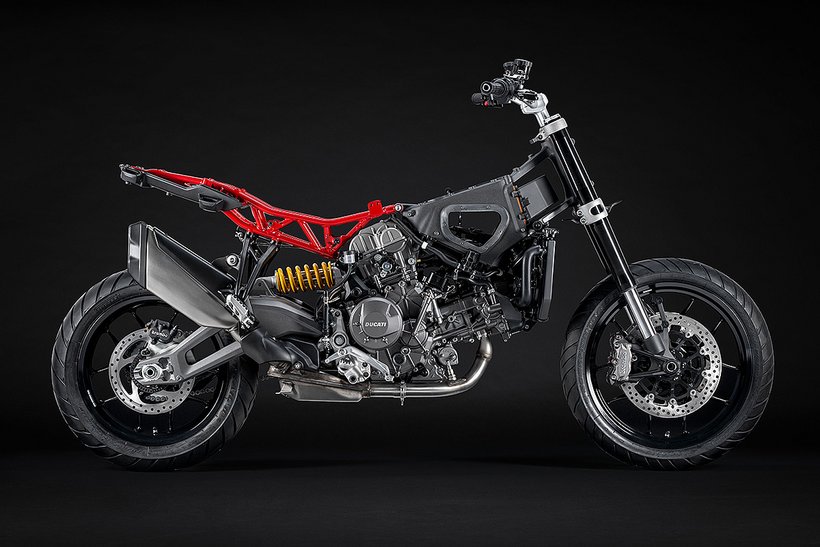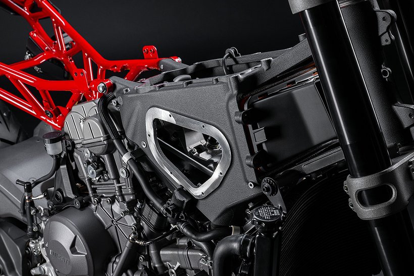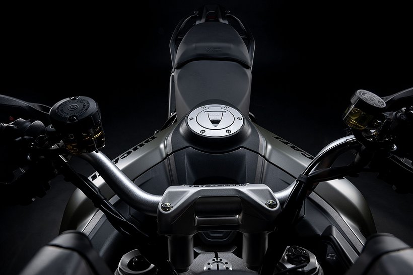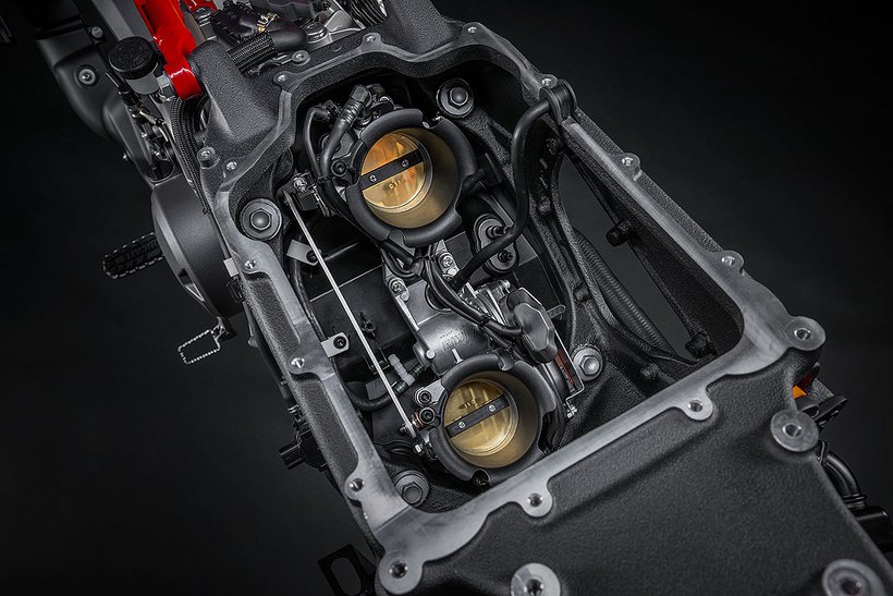 Das 90°-V2-Layout ermöglicht den Bau eines schlanken, charakterstarken Motors mit exzellentem Sound und kraftvoller Leistungsentfaltung – ganz in bester Ducati-Tradition. Der 90°-Zylinderwinkel sorgt zudem für einen natürlichen Massenausgleich der Kräfte erster Ordnung, weshalb keine Ausgleichswelle zur Reduzierung von Vibrationen notwendig ist. Um die Gewichtsverteilung weiter zu optimieren, wurden die Zylinder um 20° nach hinten geneigt, ausgehend vom horizontalen Zylinder. Dieser Motor garantiert exzellentes Handling und sorgt so für maximalen Fahrspaß.