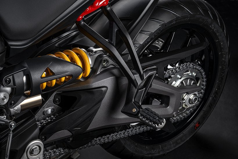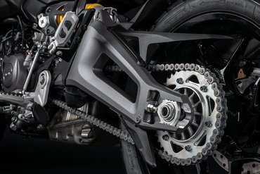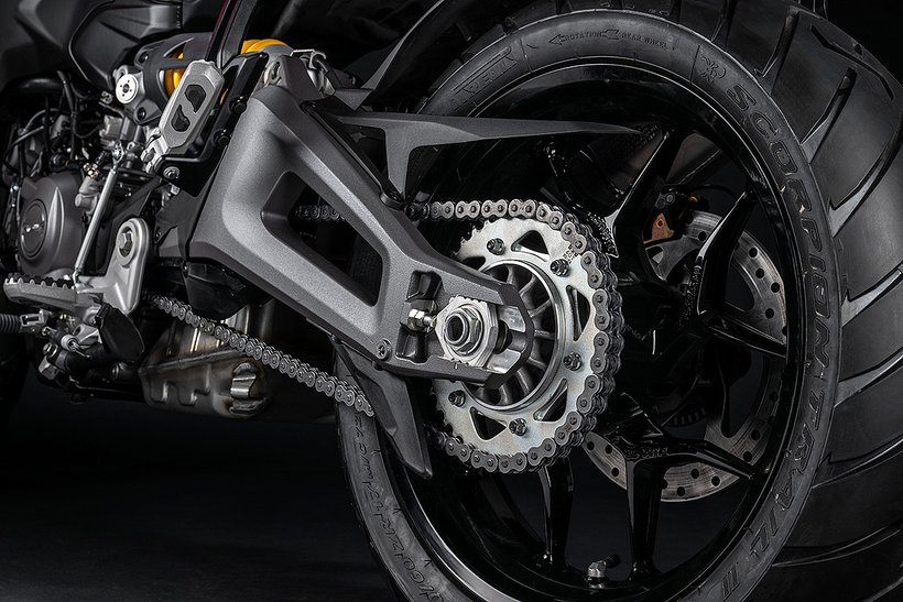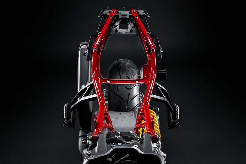 Die speziell entwickelte Zweiarmschwinge aus Aluminium-Druckguss ist robuster und direkt am Motor befestigt. Im Vergleich zur Multistrada V2 wurde der Schwingenlagerpunkt um 6 mm…