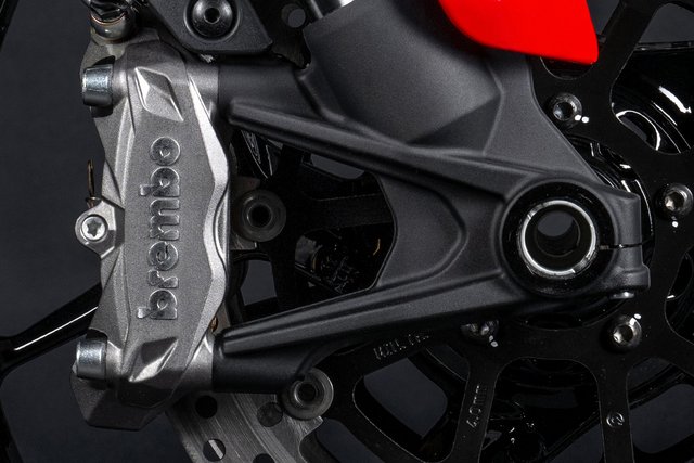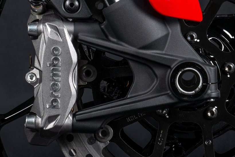 Das Brembo-Bremssystem garantiert herausragende Bremsleistung bei gleichzeitig höchster Präzision und Sensibilität am Bremshebel. Es bietet eine exzellente Linearität zwischen der aufgebrachten Bremskraft und der Bremsperformance. Vorne kommen Monoblock-Bremssättel des Typs Brembo M4 32 mit jeweils vier 32-mm-Kolben zum Einsatz, die auf zwei 320 mm Bremsscheiben mit Aluminium-Scheibenträgern wirken. Die Monoblock-Bauweise der Bremssättel, die aus einem Stück gefertigt sind, sorgt für maximale Steifigkeit und Formstabilität, was die Bremspräzision und -performance weiter optimiert. Das vordere Bremssystem wird von einer Brembo Radialpumpe mit einstellbaren Hebeln gesteuert, die ein exzellentes Gefühl vermittelt und eine Bremsleistung bietet, die in diesem Segment Maßstäbe setzt. Hinten sorgt eine 265 mm Bremsscheibe in Kombination mit einer Brembo 2-Kolben-Bremssattel für effektive Verzögerung.