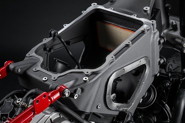 Die im Druckgussverfahren gefertigten Kurbelgehäuse sind so ausgelegt, dass sie die Wasserkammer um die Zylinderlaufbuchsen aufnehmen. Wie beim Superquadro-Motor ist auch dieser V2 mit Aluminiumlaufbuchsen ausgestattet, die bereits in einer frühen Phase der Montage in das Kurbelgehäuse eingesetzt werden. Diese Konstruktion ermöglicht eine direkte Befestigung des Zylinderkopfs am Kurbelgehäuse, wodurch die strukturelle Steifigkeit des Motors erhöht und gleichzeitig ein kompaktes Motorlayout begünstigt wird. Darüber hinaus fördern die dünnwandigen Laufbuchsen einen effizienten Wärmeaustausch mit dem Kühlmittel, das entlang ihrer Außenflächen zirkuliert.