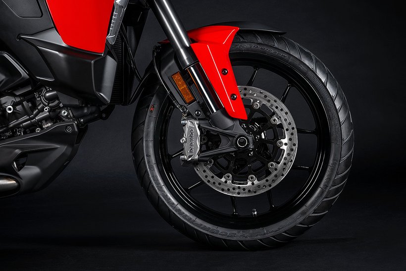 Die Aluminium-Leichtmetallfelgen, übernommen von der Multistrada V4, haben die Dimensionen 3,0 x 19 Zoll vorne und 4,5 x 17 Zoll hinten. Durch eine Gewichtsreduktion von 1,7 kg im Vergleich zum Vorgängermodell tragen sie wesentlich zur verbesserten Agilität bei. Die Felgen sind mit Pirelli Scorpion Trail II Reifen ausgestattet: vorne in der Dimension 120/70 ZR19 und hinten in 170/60 ZR17.
