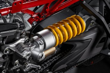 Die vordere Federung übernimmt eine voll einstellbare Marzocchi-USD-Gabel mit 45-mm-Standrohren. Das hintere voll einstellbare Marzocchi-Federbein mit externem Ausgleichsbehälter ist über eine progressive Umlenkung direkt an der Schwinge montiert. Bei der S-Version kommt das Ducati Skyhook Suspension System (DSS) zum Einsatz – ein semi-aktives Fahrwerk, bei dem Zug- und Druckstufe sowie die Federvorspannung am Federbein elektronisch angepasst werden.