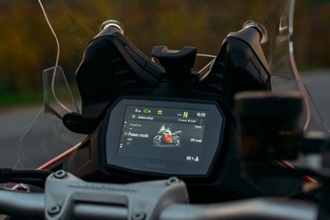 Der ROAD-Modus ist übersichtlich gestaltet und fokussiert sich auf die für den Straßenbetrieb relevanten Informationen. Der kreisförmige Drehzahlmesser mit der Ganganzeige in der Mitte nimmt die gesamte rechte Seite des Displays ein. Geschwindigkeit und gewählter Riding Mode werden auf der linken Seite angezeigt. In den Ecken des Dashboards befinden sich die Daten des Bordcomputers: Kraftstoffstand, Uhrzeit, Kühlmitteltemperatur und Lufttemperatur. Das ROAD PRO-Layout erhöht die Informationsdichte, indem der Drehzahlmesser in die Mitte rückt. Links entsteht dadurch Platz für die Anzeige der abgerufenen Leistung und des Drehmoments in Prozent, während rechts die Parameter des aktiven Riding Modes angezeigt werden. Im RALLY-Modus wird das Dashboard zu einem echten Navigationsinstrument. Auf der linken Seite wird der Tripmaster eingeblendet, der die Funktionsweise eines Rallye-Tripmasters simuliert und eine manuelle Anpassung des Kilometerzählers über die Tasten am Lenker ermöglicht. Die Ganganzeige erscheint vergrößert unter dem geraden Drehzahlmesserbalken im oberen Bereich des Displays. Geschwindigkeit wird etwas kleiner dargestellt, die Reichweite direkt darunter. Rechts werden die Details der Assistenzsysteme eingeblendet.