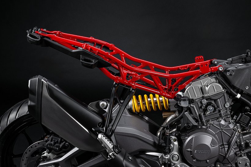Der 90°-V2-Motor mit 890 cm³ Hubraum ist mit 54,9 kg um 5,4 kg leichter als sein Vorgänger, der Testastretta Evoluzione 11°. Ausgestattet mit der variablen Ventilsteuerung IVT und Einlassventilen mit hohlem Ventilschaft, setzt er neue Maßstäbe in der Geschichte der Ducati-Zweizylindermotoren. Er kombiniert Leichtigkeit, Kompaktheit, geringen Kraftstoffverbrauch und niedrige Emissionen (Euro5+ Homologation) und stellt somit eine perfekte Balance aus Performance und Effizienz dar. Mit einer Bohrung von 96 mm und einem Hub von 91,5 mm ergibt sich ein Verhältnis von 1,56 – ein Wert, der zwischen dem Testastretta- und dem Superquadro-Motor liegt. Dadurch wird im Straßenbetrieb ein besserer Drehmomentverlauf als beim Superquadro erreicht. Die für Ducati typische Vielseitigkeit des Zweizylindermotors zeigt sich auch in diesem V2, der eine maximale Leistung von 115 PS bei 10.750 U/min bietet, wobei der Begrenzer bei 11.500 U/min greift. Das maximale Drehmoment von 92 Nm wird bei 8.250 U/min erreicht, und mehr als 70% des maximalen Drehmoments stehen bereits bei 3.500 U/min zur Verfügung, wobei dieser Wert bis 11.000 U/min nie unter 75% fällt. Die gleichmäßige Verbrennung bei niedrigen Drehzahlen sorgt für eine äußerst konstante Leistungsabgabe bei geringer Drosselklappenöffnung. Das größere Schwungrad trägt zusätzlich zum Fahrspaß bei, insbesondere bei Touren oder im Stadtverkehr, da der Motor ein äußerst sanftes Ansprechverhalten aufweist.