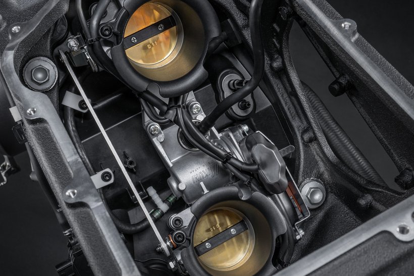 Die Kraftstoffversorgung erfolgt über 52-mm-Drosselklappen in Verbindung mit einem Ride-by-Wire-System, das vier unterschiedliche Leistungsmodi bietet, um die Leistungsabgabe optimal an verschiedene Fahrsituationen anzupassen. Dank individueller Kennfelder für jeden Gang kann das System die Performance anpassen und sorgt so für eine perfekt abgestimmte Gasannahme in allen Gängen. Der in beiden Motorversionen integrierte Klopfsensor gewährleistet einen zuverlässigen Betrieb, selbst wenn kein hochoktaniger Kraftstoff verfügbar ist. So kann das Motorrad auch in Regionen mit eingeschränkter Verfügbarkeit von hochwertigem Kraftstoff problemlos betrieben werden.