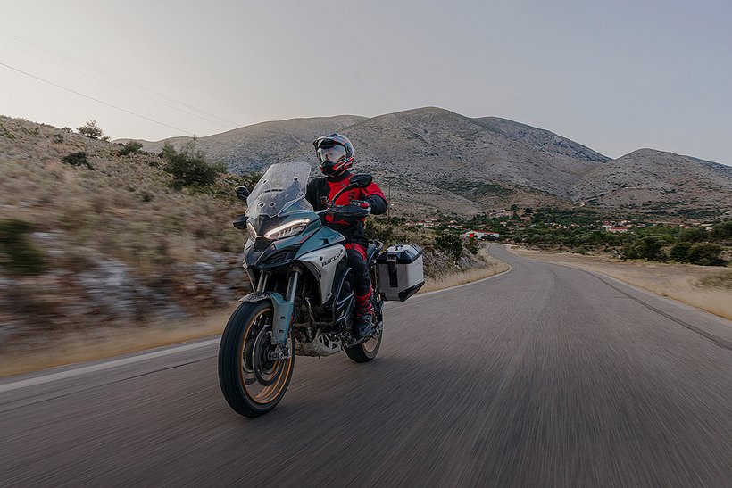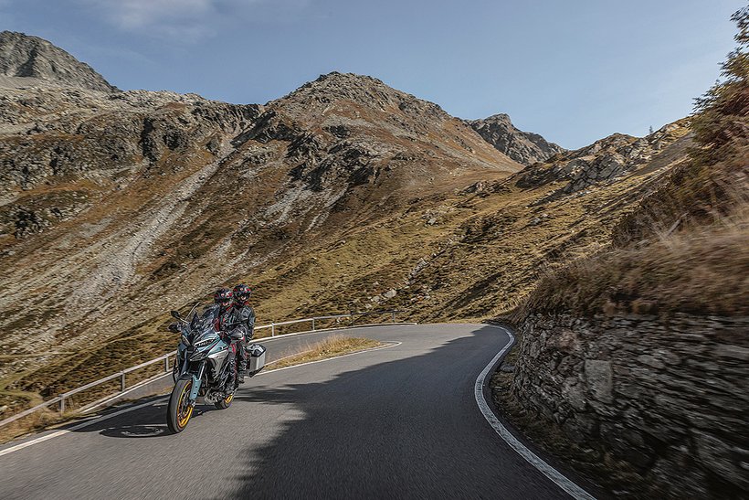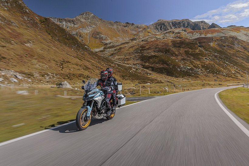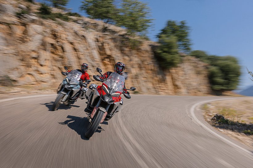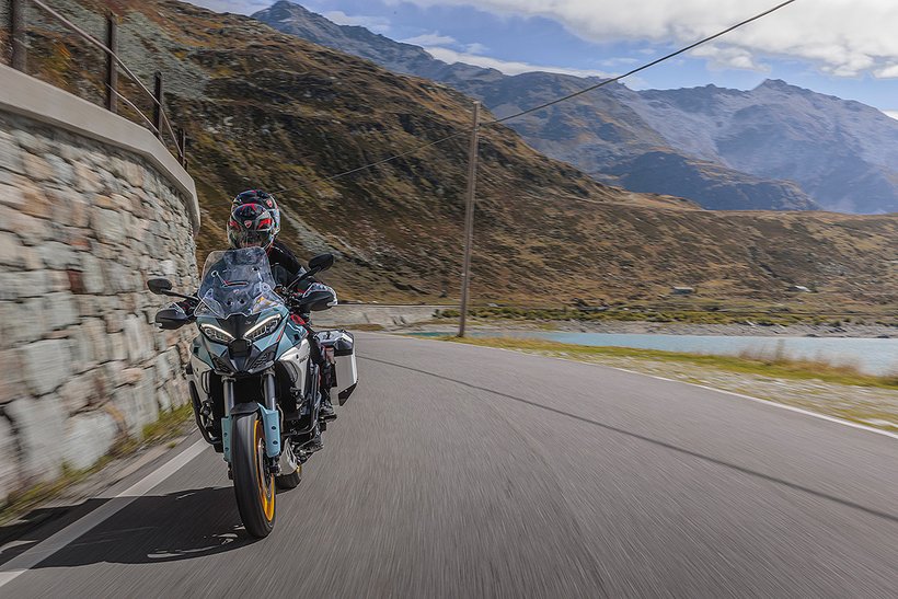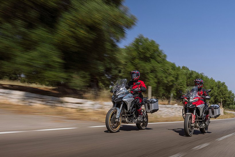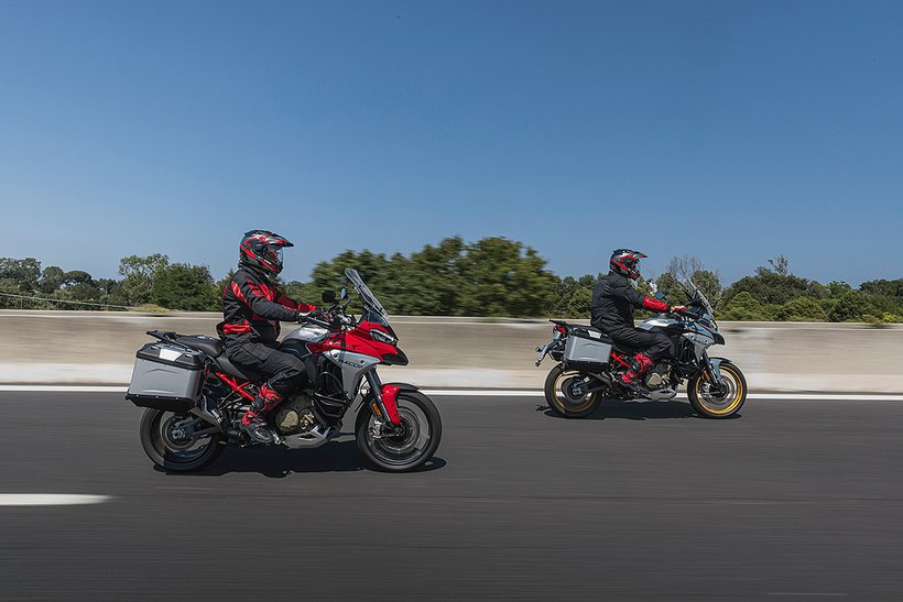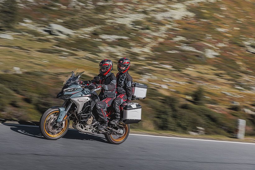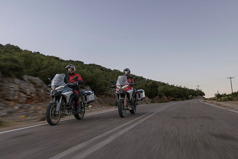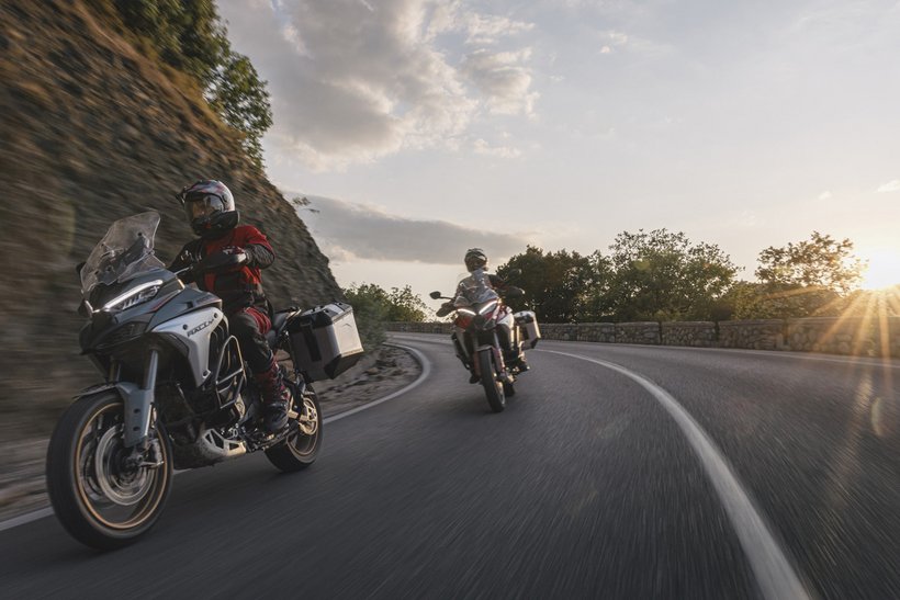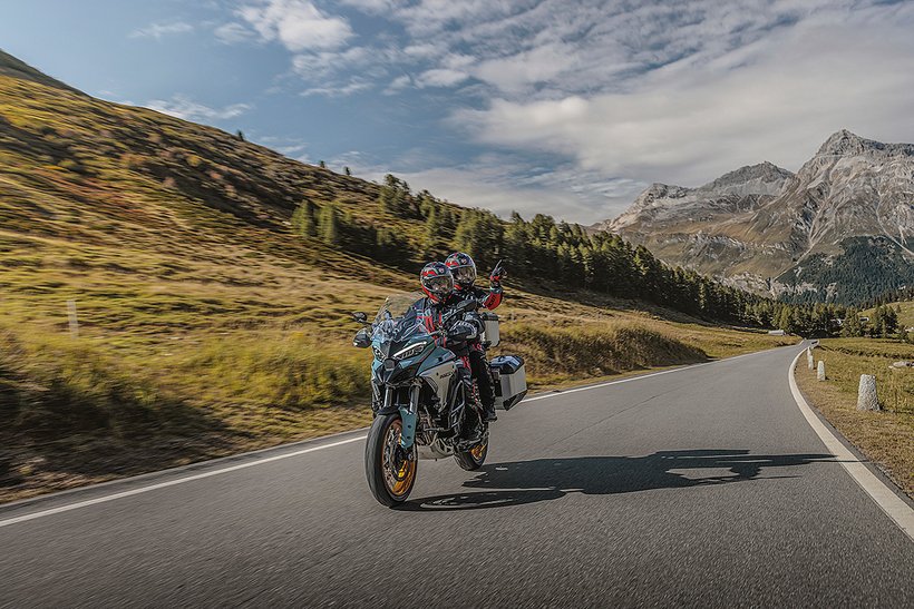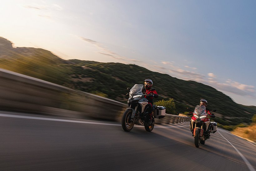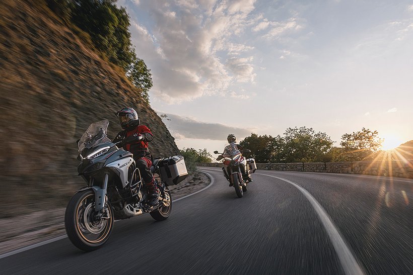 In diesem Modus steht die volle Motorleistung zur Verfügung, jedoch mit einer sanfteren und weniger direkten Gasannahme für ein harmonischeres Fahrverhalten. Die aktive Sicherheit wird durch höhere Eingriffsstufen bei der Ducati Traction Control (DTC) und der Ducati Wheelie Control (DWC) erhöht. Das ABS arbeitet auf Stufe 3, ideal für den Touring-Einsatz: Es aktiviert sowohl die Kurven-ABS- als auch die Anti-Lift-Up-Funktion und sorgt gleichzeitig für eine ausgewogene Bremsverteilung zwischen Vorder- und Hinterrad. Bei den Versionen RS, S, Pikes Peak und Rally wird zudem ein Fahrwerks-Setup gewählt, das speziell auf Langstreckenkomfort ausgelegt ist und sowohl Fahrer als auch Beifahrer maximalen Komfort bietet.