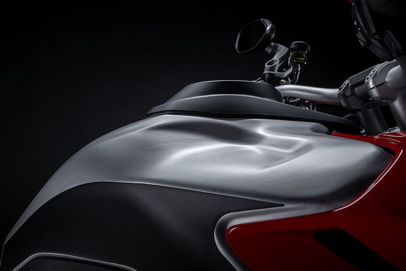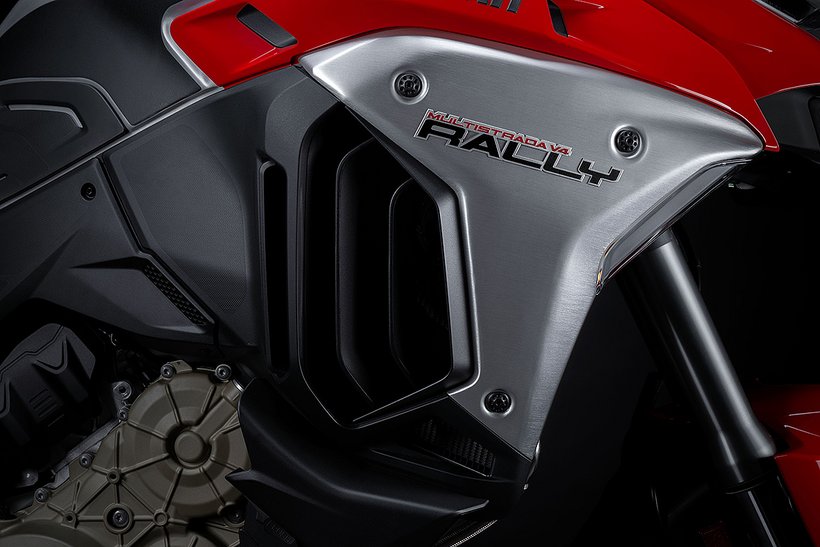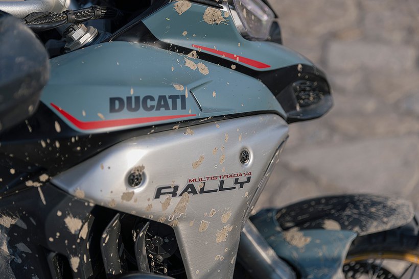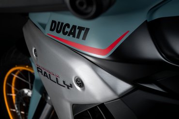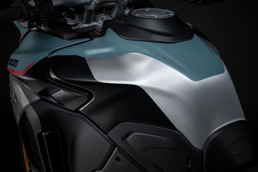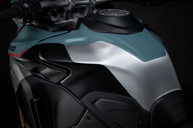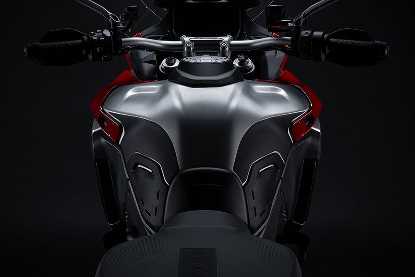 Der Tank selbst hat ein Volumen von 30 Litern – ein wesentliches Merkmal, das besonders für Fernreisen und lange Etappen abseits befestigter Straßen von Bedeutung ist. Trotz des höheren Fassungsvermögens wurde großer Wert darauf gelegt, die Linienführung harmonisch und ausgewogen zu gestalten. Der Tank spielt, von der Seite betrachtet, ebenfalls eine zentrale Rolle im Design der Multistrada V4 Rally und wird durch ein neu gestaltetes „Rally“-Logo auf dem Aluminiumseitendeckel aufgewertet. Die Proportionen des Tanks unterstützen nicht nur die muskulöse und entschlossene Optik, sondern auch die funktionale Ergonomie, indem sie dem Fahrer in stehender wie in sitzender Position maximale Bewegungsfreiheit bieten.