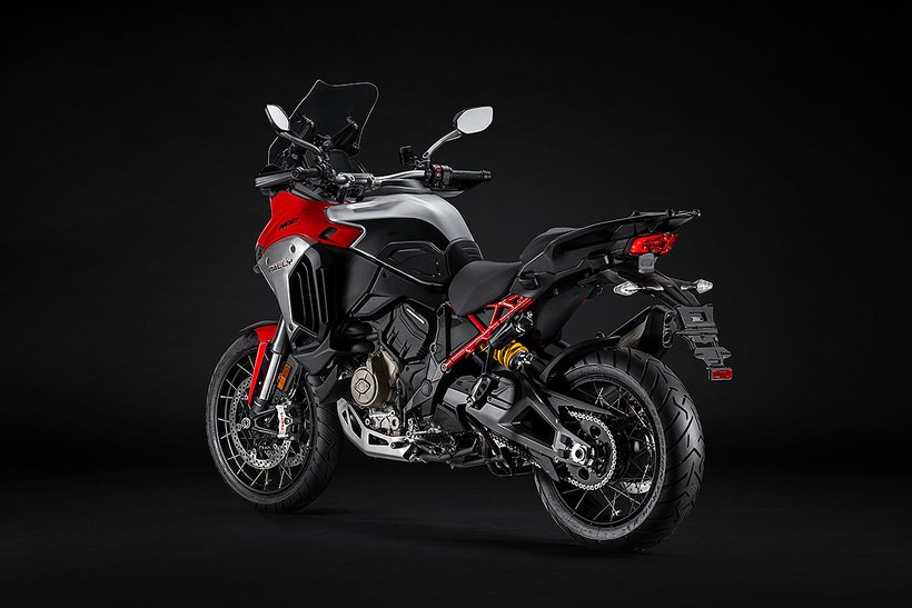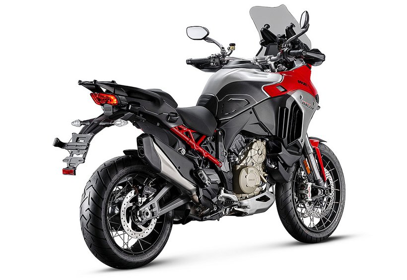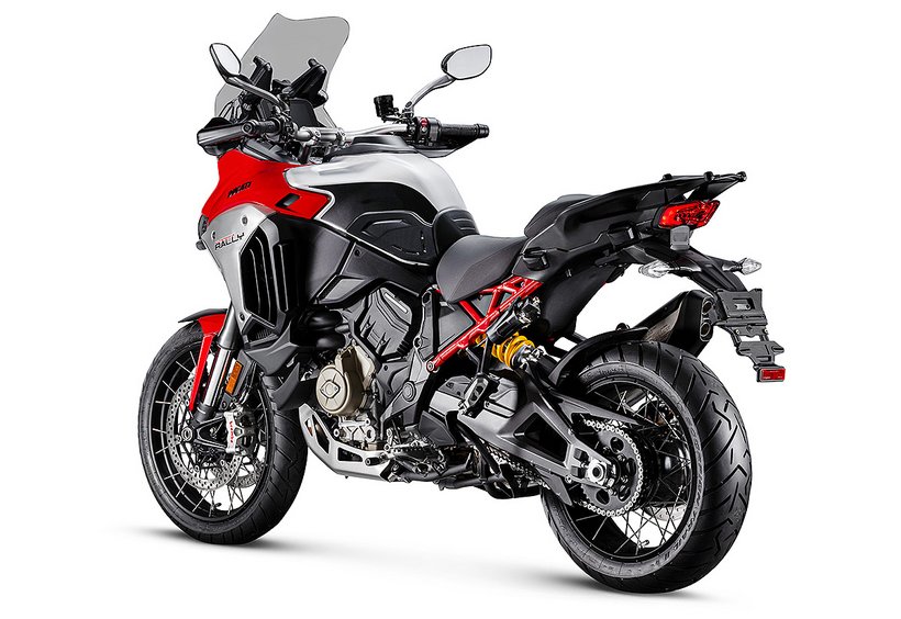 Um die Offroad-Fähigkeiten der Multistrada V4 Rally zu verbessern, verfügt das Fahrwerk über einen Federweg von 200 mm, der im Vergleich zur Multistrada V4 vorne und hinten um 30 mm bzw. 20 mm vergrößert wurde. Die Bodenfreiheit beträgt 230 mm (+10 mm) und erleichtert das Befahren der schwierigsten Passagen. Durch das Plus an Federweg wird zudem der Fahrkomfort in jeder Fahrsituation spürbar erhöht.