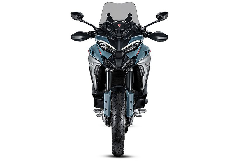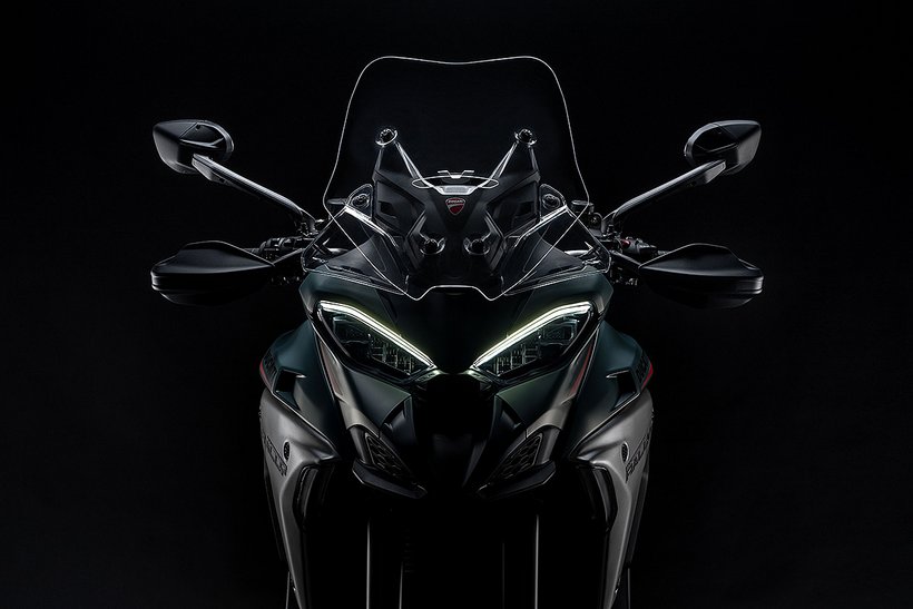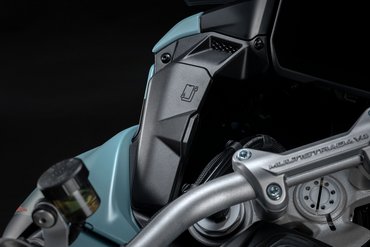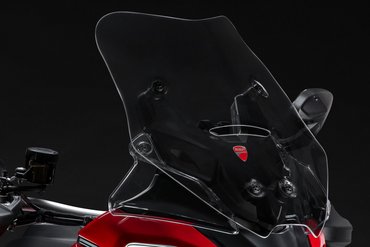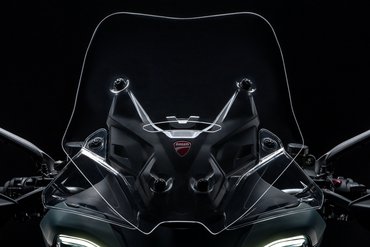 Das Windschild spielt eine entscheidende Rolle bei einem Reisemotorrad, da es den Fahrtwind, Winddruck und die Verwirbelungen maßgeblich beeinflusst. Deshalb wurde bei der Entwicklung der Multistrada-V4-Modellreihe besonders viel Wert auf eine optimale Lösung gelegt, unterstützt durch umfassende Simulationen und Windkanaltests. Das Resultat ist ein effektives und zugleich elegantes Windschild, das sich mühelos mit nur einem Finger in der Höhe verstellen lässt. Um bei den Rally-Modellen maximalen Fahrkomfort auf langen Etappen zu gewährleisten, wurde das Windschild um 20 mm höher und 40 mm breiter gestaltet. Zusammen mit den seitlichen Windabweisern, die bei den Rally-Modellen ebenfalls überarbeitet wurden, um noch besseren Windschutz – besonders für den Beifahrer – zu gewährleisten, da die Luftströmungen weiter hinten zusammenfließen, bietet es erstklassigen Windschutz und minimiert störende Fahrtwindgeräusche, um auch auf langen Touren höchsten Komfort zu garantieren.