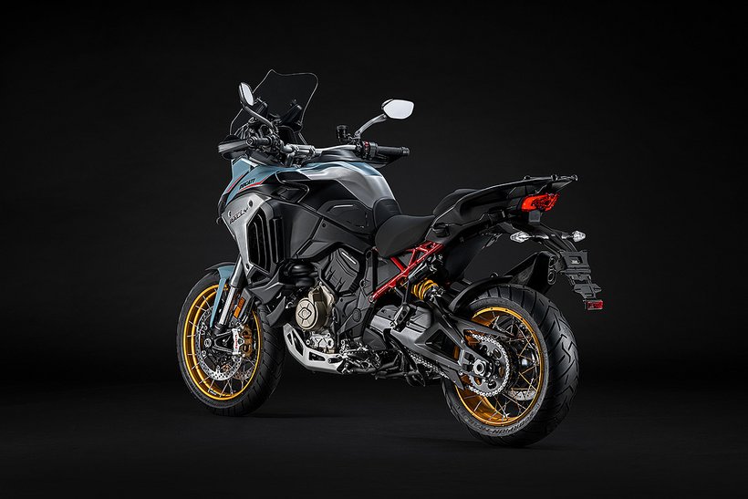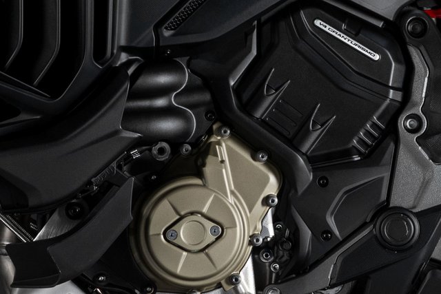 Der Motor ist das Herzstück jeder Multistrada V4. Der V4-Granturismo-Motor ist außergewöhnlich leicht (66,7 kg) und extrem kompakt. Er besticht durch seine bemerkenswerte Laufruhe bei niedrigen Drehzahlen und einen gleichmäßigen Drehmomentverlauf. Mit einem Hubraum von 1.158 ccm produziert dieser V4-Motor auch in der Euro-5+-Konfiguration beeindruckende 170 PS bei 10.750 Umdrehungen pro Minute und ein maximales Drehmoment von über 120 Nm, was ihn zum Klassenprimus in Sachen Performance und Leichtigkeit macht. Besonderes Augenmerk wurde auf das Drehmoment gelegt, das für jede einzelne Übersetzung optimiert wurde, um eine konstante Leistungsabgabe im unteren Drehzahlbereich, ein kräftiges Drehmoment im mittleren Bereich und einen sportlich-dynamischen Charakter im oberen Bereich zu gewährleisten.