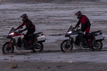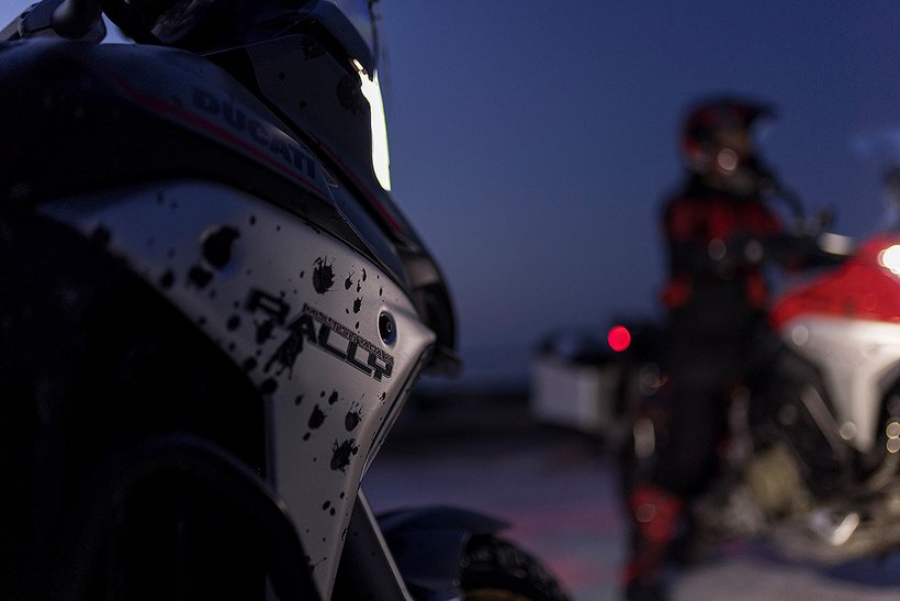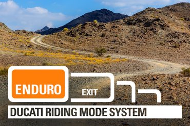Der Riding Mode Enduro ermöglicht es der Multistrada V4 Rally, ihr Offroad-Potenzial optimal auszuschöpfen, unterstützt durch das 19-Zoll-Vorderrad, eine optimierte Ergonomie, die das Fahren im Stehen erleichtert, sowie das Mehr an Bodenfreiheit durch den erhöhten Federweg. Die Leistung wird in einem speziell für diesen Einsatz abgestimmten Powermode auf 114 PS begrenzt, das Ansprechverhalten ist jedoch spontaner als im gleich starken Urban-Modus – mit einer direkteren Reaktion. Die Fahrwerksabstimmung des adaptiven Fahrwerks wurde speziell für den Offroad-Einsatz konfiguriert und wird am Dashboard durch ein spezielles Symbol mit einem Offroad-Helm angezeigt. Die DTC- und DWC-Systeme werden auf die niedrigste Interventionsstufe gesetzt, während das ABS auf Stufe 1 eingestellt ist – ideal für Untergründe im Gelände. In dieser Einstellung sind die Cornering-Funktion und die Anti-Lift-Up-Funktion des ABS-Systems deaktiviert.
