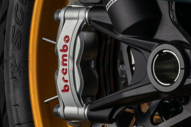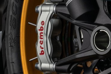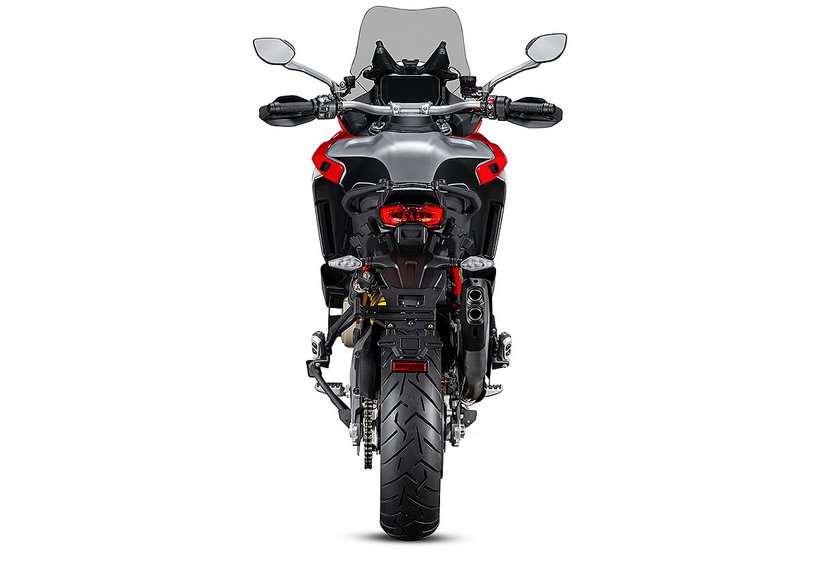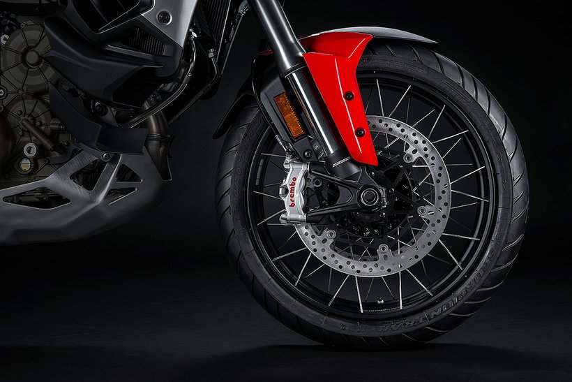 Die Bremsanlage orientiert sich technisch stark an der der Panigale V4 und zählt damit zu den leistungsstärksten Systemen im Segment. Vorne kommen radial montierte Bremspumpen mit verstellbarem Hebel, zwei 330 mm Bremsscheiben und Stylema® M50-Monobloc-Bremssättel von Brembo zum Einsatz. Diese werden aus einem einzigen Aluminiumblock gefräst, sind besonders leicht und kompakt, und bieten durch ihre optimierte Belüftung eine ausgezeichnete thermische Stabilität und Performance. Die vier 30-mm-Kolben der Stylema®-Zangen ermöglichen eine exzellente Dosierbarkeit bei gleichzeitig kurzem Hebelweg – ideal für sportliches Fahren. Auch die Hinterradbremse wurde weiterentwickelt: Eine neue, leistungsfähigere Kombination aus 280 mm Bremsscheibe (6 mm dick) und Brembo-Schwimmsattel sorgt für mehr Bremskraft. Die neue regressive Hebelmechanik verbessert die Feinfühligkeit bei der Dosierung, während der vergrößerte Bremshebel für ein besseres Bremsgefühl sorgt – besonders bei kontrollierten Verzögerungen oder bei Offroad-Einsätzen.