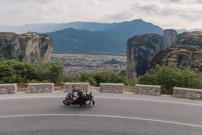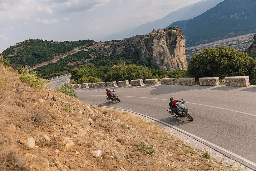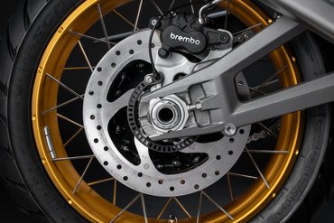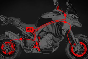 Das ABS-System bietet maximale aktive Sicherheit durch das Bosch 10.3ME Kurven-ABS, das in Kombination mit dem Brembo-Bremssystem eingesetzt wird. Es verteilt die Bremskraft unabhängig auf beide Räder – selbst in Schräglage – und reduziert so das Risiko eines Sturzes durch blockierende Räder. Das Kurven-ABS erhält in Echtzeit Schräglagendaten von der Trägheitsplattform und passt sein Verhalten in Abstimmung mit den Riding Modes an die jeweiligen Fahrbedingungen und Situationen an. Es lässt sich in drei Stufen einstellen, die das Bremsverhalten und die Funktionalität variieren. Diese Stufen sind standardmäßig mit den verschiedenen Riding Modes verknüpft. Dabei werden Situationen wie das Abheben des Hinterrads beim Bremsen, das Blockieren des Hinterrads oder ein mögliches Blockieren des Vorderrads in Schräglage je nach Stufe unterschiedlich behandelt – angefangen bei der konservativsten Einstellung, die mit den Modi „Urban“, „Wet“ und „Touring“ verbunden ist, über den dynamischeren Fahrmodus „Sport“ bis hin zur entspanntesten Einstellung im Modus „Enduro“. Letzterer beschränkt den Antiblockiereffekt auf das Vorderrad und erlaubt ein kontrolliertes Driften des Hinterrads auf losem Untergrund. Das ABS kann ausschließlich im Fahrmodus „Enduro“ deaktiviert werden. Die Anti-Dive-Funktion ist jetzt effektiver, da das System die hydraulische Bremsung auf Grundlage des tatsächlichen Drucks der Bremssättel anpasst, jede Aktion des ABS berücksichtigt und die Position der Gabel entlang ihres Hubs exakt kennt. Die Stabilität und Sicherheit werden zusätzlich durch das Electronic Combined Braking System erhöht, das bei Betätigung der Hinterradbremse automatisch Bremsdruck auf die Vorderradbremse aufbaut, um die Gesamtbremswirkung zu optimieren. Wird hingegen die Vorderradbremse betätigt, erzeugt das System eine ergänzende Bremskraft am Hinterrad für eine harmonischere Verzögerung. Darüber hinaus variiert das kombinierte Bremssystem sowohl die Anti-Dive- als auch die Anti-Blockier-Funktion je nach gewähltem Lastmodus und verteilt mehr Bremsmoment auf die Hinterradbremse, wenn diese eine größere Last aufnehmen kann. So optimiert das System die Bremswirkung, verbessert die Lastverteilung und maximiert die Gesamtleistung. Die neu für den Offroad-Einsatz entwickelte ABS-Stufe 1 verteilt die Bremskraft auch dann auf das Hinterrad, wenn nur die Vorderradbremse betätigt wird. Dadurch wird die effektive Verzögerung um bis zu 50 % erhöht, während die Schlupfbegrenzung aktiv bleibt – solange die Bremskraft einen definierten Grenzwert nicht überschreitet. Wenn der Fahrer ausschließlich mit dem Hinterrad bremst oder die Bremskraft diesen Grenzwert überschreitet, wird die ABS-Funktion am Hinterrad deaktiviert. Das Blockieren des Rads ist dann möglich – ein gezieltes Manöver für den Einsatz im Gelände.