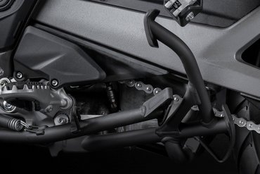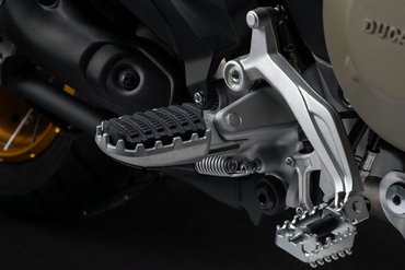 Gerade im Gelände ist der „Grip“ auf den Fußrasten wichtig. Mit einem Handgriff sind die Gummiauflagen von den etwas breiteren, robusten Fußrasten abgenommen und man findet auf den Stahlrasten genug Halt. Der Schalthebel ist mit einem Klappmechanismus versehen, um das Schadensrisiko durch mechanische Einwirkungen zu reduzieren. Der Fußbremshebel ist in der Höhe einstellbar und lässt sich ohne Werkzeug mit einem Handgriff auf stehendes Fahren anpassen. Die Beifahrerfußrasten sind mit größeren Gummieinsätzen ausgestattet, um Vibrationen noch weiter zu reduzieren.