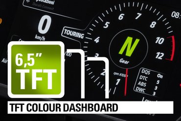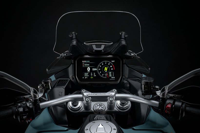 Das 6,5-Zoll-TFT-Farbdisplay ist mit einer Oberfläche aus Mineralglas ausgestattet, dem gleichen Material, das in modernen Smartphones verwendet wird. Dies bietet zwei Vorteile: Es verbessert die Sichtbarkeit, selbst bei direkter Sonneneinstrahlung, und reduziert Reflexionen. Die Informationen sind übersichtlich und gut lesbar, mit einem runden Drehzahlmesser mit digitaler Nadel in der Mitte sowie Anzeigen für den eingelegten Gang, Kraftstoffstand, Außentemperatur und Motortemperatur. Zudem zeigt das Display elektronische Kontrollstufen, Riding Modes und Fahrwerkseinstellungen an. Zusätzliche Informationen, wie die Einstellungen für die Federung, werden ebenfalls angezeigt, und über die GPS-Navigations-App Sygic wird das Kartenmaterial des Navigationssystems bereitgestellt. Dies ist der "Ducati Connect"-App zu verdanken, die eine Verbindung zum Smartphone herstellt und Funktionen wie das Überprüfen des Telefonbuchs, das einfache Beantworten eingehender Anrufe und das Hören von Musik über das Ducati Multimedia System (DMS) ermöglicht.