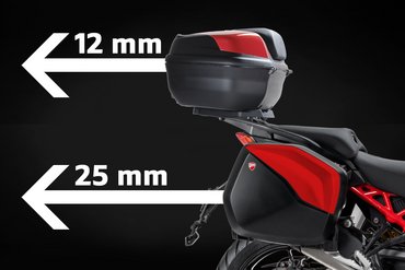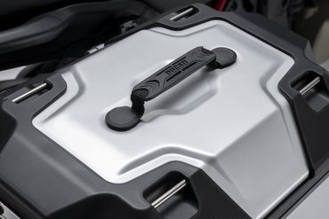Bei der Wahl eines Koffersystems spielen zahlreiche Faktoren eine Rolle: Volumen, Bauweise, Aerodynamik, Montagekomfort, Positionierung und nicht zuletzt das Design. Ducati hat bei den Multistrada V4 FL Modellen alle diese Aspekte berücksichtigt – und konsequent weiterentwickelt. So wurden sowohl die Seitenkoffer als auch das Topcase um 25 mm weiter nach hinten versetzt, um dem Sozius spürbar mehr Bewegungsfreiheit und Komfort zu bieten. Die Kunststoffkoffer fassen ein beeindruckendes Gesamtvolumen von 60 Litern (25 + 35 Liter) und lassen sich dank cleverem Montagesystem schnell und einfach befestigen: Von oben eingesetzt, rasten sie mit einem Handgriff sicher ein – die Haltepunkte sind dezent im Design integriert. Die schwimmende Lagerung der Koffer wurde im Windkanal optimiert, um die aerodynamischen Auswirkungen zu minimieren. Das Ergebnis: hohe Stabilität – selbst bei hohem Tempo. Auch optisch sind die Koffer perfekt abgestimmt: Fahrzeuglackierte Abdeckungen sorgen für eine harmonische Integration ins Gesamtbild. Für Globetrotter bietet Ducati zudem robuste Aluminiumkoffer mit einem Gesamtvolumen von 76 Litern (41 + 35 Liter), die auch extremen Bedingungen standhalten.