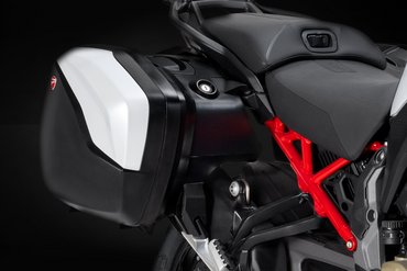 Neben ihrer umfangreichen Serienausstattung bietet die Multistrada V4 Rally auch eine große Auswahl an Zubehör. Zusätzlich zu verschiedenen Sitzbänken, die den ergonomischen Anforderungen von Fahrer und Beifahrer gerecht werden, gibt es eine Reihe von Windschutzscheibenoptionen und natürlich Gepäcklösungen, die sowohl für den Tank als auch für die Heckmontage konzipiert sind – ein Topcase oder eine Weichtasche – für diejenigen, die die Allround-Touring-Fähigkeiten der Multistrada V4 Rally noch weiter verbessern möchten. Die Aluminium-Seitenkoffer, die als Zubehör erhältlich und bei den Ausstattungsvarianten Adventure sowie Full serienmäßig sind, verfügen nun über eine Dreistufenverriegelung. Dadurch lassen sich die Koffer auch ohne Schlüssel öffnen und schließen, selbst wenn sie vom Motorrad abgenommen wurden, was ihre Praktikabilität und Vielseitigkeit erhöht.