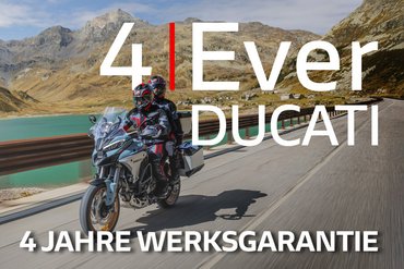 Dank intensiver Praxistests, modernster Simulationstechnologien und kontinuierlich optimierter Produktionsprozesse erreichen Ducati Modelle heute ein neues Höchstmaß an Zuverlässigkeit. Dieses Vertrauen in die eigene Qualität ist die Grundlage für 4Ever Ducati: eine vierjährige Werksgarantie ohne Kilometerbegrenzung, inklusive Mobilitätsservice – exklusiv für alle Multistrada- und DesertX-Modelle.