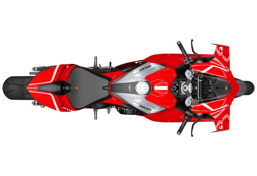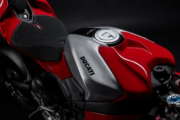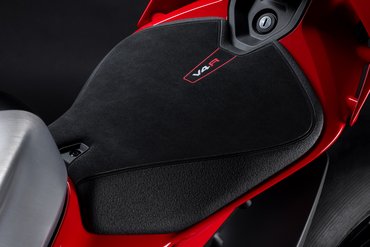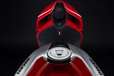 Die Ergonomie der Panigale V4 R folgt den Weiterentwicklungen der neuen Panigale V4 7G mit dem Ziel, die Kontrolle über das Motorrad in den anspruchsvollsten Rennsituationen zu verbessern. Das steigert die Performance sowohl bei einer schnellen Runde als auch über die gesamte Renndistanz. Die wichtigsten Neuerungen betreffen Sitz (50 mm breiter), Tank (neue Form), die Kontaktflächen zwischen Fahrer und Motorrad sowie die Position der Fußrasten. Das neue Tankdesign mit einer optimierten Heckpartie erleichtert die Bremsphasen und das „Hanging Off“ in Kurven, da es eine bessere Knieauflage für Fahrer jeder Körpergröße ermöglicht. So wird der Kraftaufwand reduziert, die Position in Schräglage stabilisiert und die Effizienz beim Bremsen gesteigert. Dank dieser Änderungen ist der Fahrer auch besser geschützt, wenn er sich auf der Geraden hinter die Verkleidung duckt. Große Aufmerksamkeit wurde auch der Positionierung der Fußrasten gewidmet, die nun 10 mm weiter innen liegen – ohne die Auflagefläche für den Fahrer zu reduzieren. Die neue Position ermöglicht dem Fahrer eine aerodynamischere Fahrhaltung, erhöht die Bodenfreiheit und sorgt für eine entspanntere Fahrt, da weniger auf die Fußposition geachtet werden muss, um unerwünschten Kontakt mit dem Asphalt zu vermeiden.