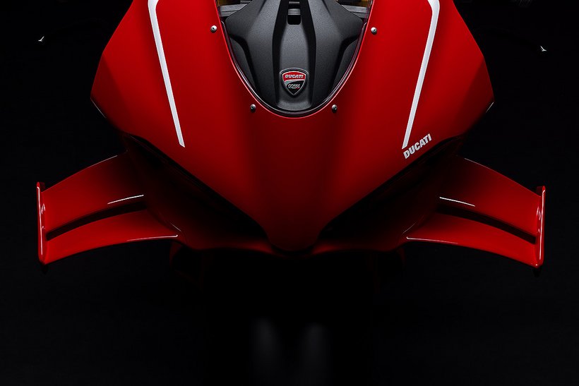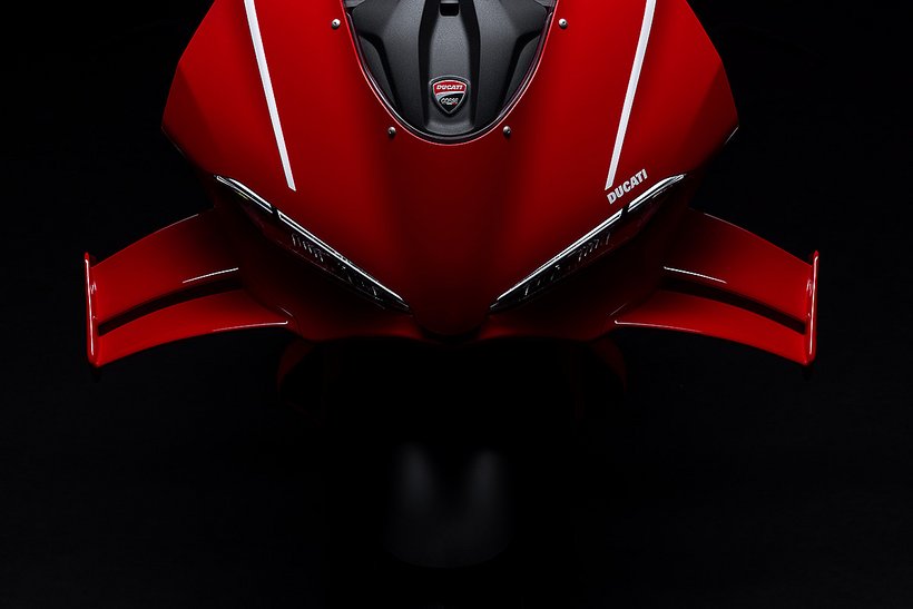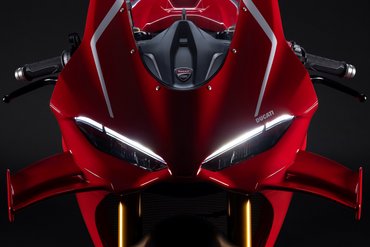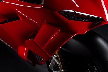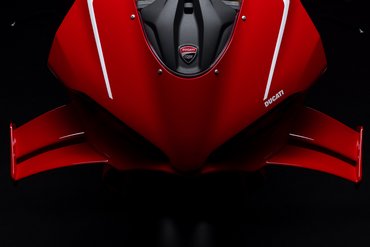 Mit einer vom Wind geformten Silhouette ist die Panigale V4 R pure Aerodynamik. Die Panigale V4 R wurde strömungstechnisch komplett überarbeitet, um den Luftwiderstand zu reduzieren und gleichzeitig den Abtrieb zu erhöhen. Das Aerodynamikpaket umfasst neu gestaltete Winglets, die noch leistungsstärker sind als jene der Panigale V4 7G und der vorherigen R-Version. Jedes Winglet besteht aus zwei Elementen, die elegant in die Linien der oberen Verkleidung integriert sind, und zeichnet sich durch eine 20 mm größere Spannweite sowie eine neu geformte, markante Außenkante aus. Das Ergebnis: 25 % mehr Abtrieb bei gleichbleibendem Luftwiderstand – konkret entspricht das +4,8 kg bei 270 km/h und +6 kg bei 300 km/h. Um maximale Performance auf der Rennstrecke zu erzielen, ist die Panigale V4 R 7G mit einem dynamischen Frontlufteinlass ausgestattet, der in Zusammenarbeit mit Ducati Corse entwickelt wurde und das Ansaugluftvolumen erhöht. Im Vergleich zur Panigale V4 wurde die Unterkante des Einlasses um 70 mm nach vorne verlängert, wodurch sich der Luftdruck am Filter bei 300 km/h um 0,6 % steigert. Das Ergebnis: eine höhere Luftdichte und ein Leistungszuwachs von 1,3 PS bei dieser Geschwindigkeit. Der vordere Bereich des Lufteinlasses besteht aus einem speziellen Material, das sich bei Kontakt mit dem vorderen Kotflügel während einer harten Bremsung verformen kann. Die Panigale V4 R bietet dem Fahrer ein Maß an aerodynamischem Schutz, das ihn in eine Art „Luftblase“ aus stabiler Strömung eintauchen lässt – ähnlich wie auf der Desmosedici GP. So kann er auf der Geraden höhere Geschwindigkeiten erreichen und sich zwischen den Bremszonen spürbar entspannen. Die Verkleidung, die mit der Panigale V4 7G eingeführt wurde, weist einen um 4 % reduzierten Luftwiderstand auf und sorgt gleichzeitig für einen um 9 % bzw. 19 % höheren Luftstrom zu Wasser- und Ölkühler. Der erhöhte Durchfluss trägt dazu bei, die Motortemperaturen während des Einsatzes auf der Rennstrecke zu senken. Dieses Ziel wurde auch durch die Einführung eines Deflektors erreicht, der den Luftstrom in der Nähe des Ölkühlers begradigt und dessen Effizienz erhöht. Der aerodynamisch geformte vordere Kotflügel trägt ebenfalls zur Verbesserung der Gesamteffizienz bei. Das Design der Panigale V4 7G reduziert die Oberfläche der Verkleidung in der Seitenansicht und nähert sich damit dem aktuellen MotoGP-Layout an, um die Querluftdurchlässigkeit zu erhöhen. Diese Lösung macht das Motorrad bei hohen Geschwindigkeiten wendiger und weniger anfällig für Seitenwind, was durch das Feedback der Fahrer bestätigt wurde.