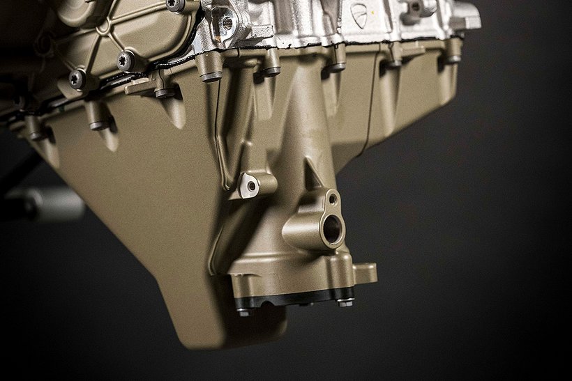 Wie bei den MotoGP-Motoren sorgt auch der Desmosedici-Stradale-Motor durch eine Semi-Trockensumpfschmierung mit Druck- und Rückförderpumpen für eine kontinuierliche und effektive…