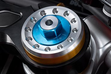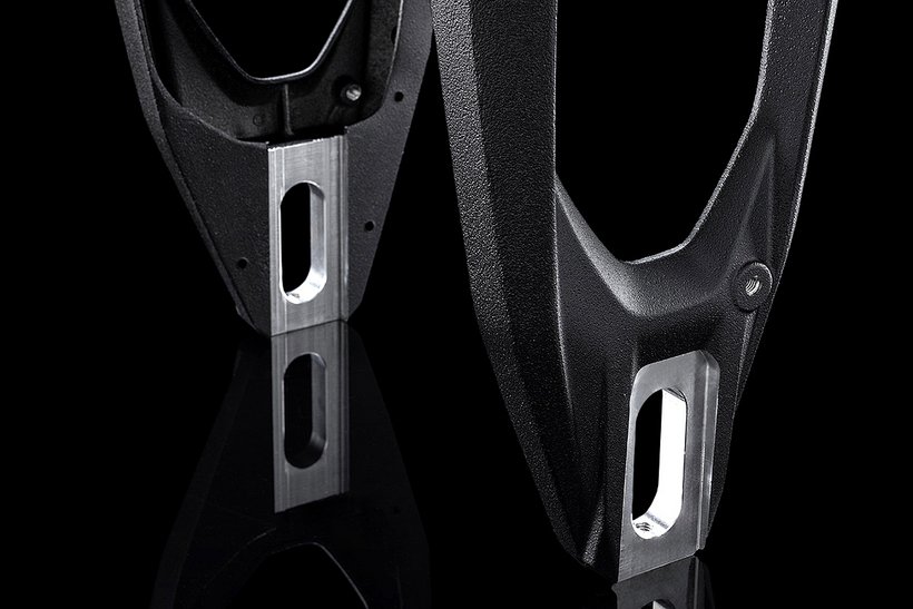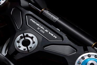 Die Gabelbrücken sind elementare Bestandteile eines jeden Fahrwerkkonzepts. Bei Panigale und Streetfighter V4 sorgen geschmiedete Gabelbrücken für eine perfekte Verbindung von Gabel und Lenkkopf. Gleichzeitig erlaubt die Dreifach-Klemmung, mit reduzierten Anzugsmomenten der Klemmschrauben zu arbeiten und so die Gabel nicht zu stark unter Druck zu setzen. Die Gabelbrücke der Panigale V4 R hat jedoch nicht nur die Aufgabe, der Gabel festen Halt zu geben – sie trägt auch die laufende Nummer des jeweiligen Motorrads, die mit der Fahrgestellnummer übereinstimmt. Ein Detail, das ihre Exklusivität eindrucksvoll unterstreicht.