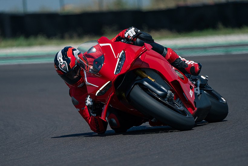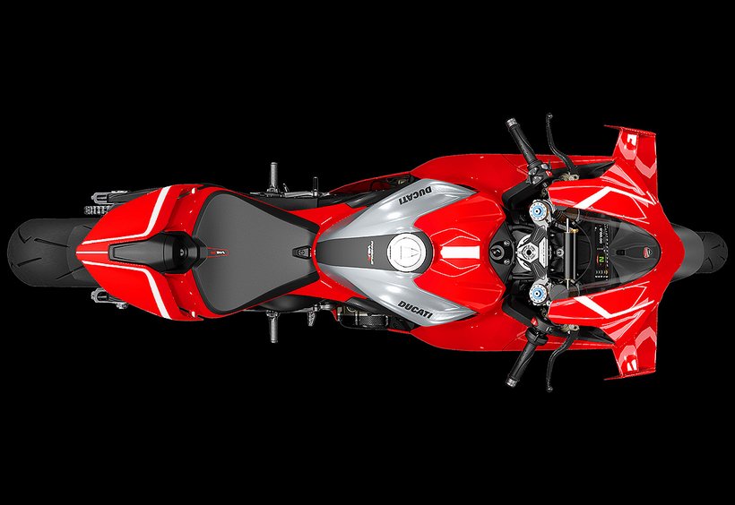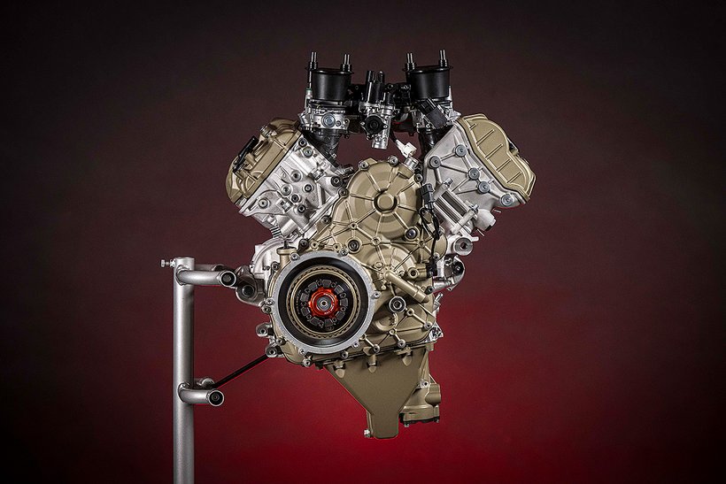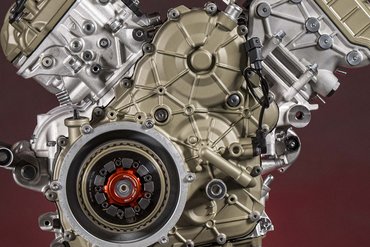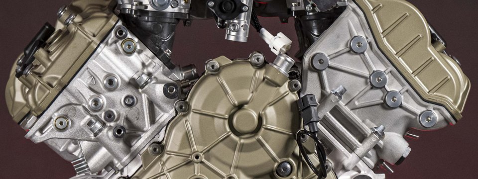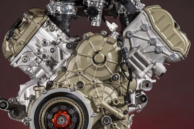 Die enge Zusammenarbeit mit Ducati Corse hat zu einem Motor geführt, der kompakt, leicht und zugleich äußerst leistungsstark ist. In der 90-Grad-V-Bauweise gleichen sich die Massenkräfte erster Ordnung konstruktionsbedingt aus, sodass auf eine Ausgleichswelle zur Reduzierung von Vibrationen verzichtet werden kann. Das spart nicht nur Gewicht, sondern verbessert auch die Drehfreudigkeit und Leistungsentfaltung des Motors. Im Vergleich zu einem klassischen Reihenvierzylinder ermöglicht die kompaktere Bauweise der V-Anordnung eine bessere Massenzentralisierung sowie eine geringere Stirnfläche, was die Aerodynamik verbessert. Zusätzlich reduziert die kürzere Kurbelwelle den gyroskopischen Effekt – ein klarer Vorteil für die Fahrdynamik, insbesondere bei schnellen Richtungswechseln. Das Desmosedici-Stradale-Triebwerk ist um 42 Grad nach hinten geneigt – wie bei den MotoGP-Motoren von Ducati. Diese Neigung verbessert die Gewichtsverteilung, schafft Platz für größere Kühler und erlaubt es, den Schwingendrehpunkt so weit wie möglich nach vorn zu verlagern.