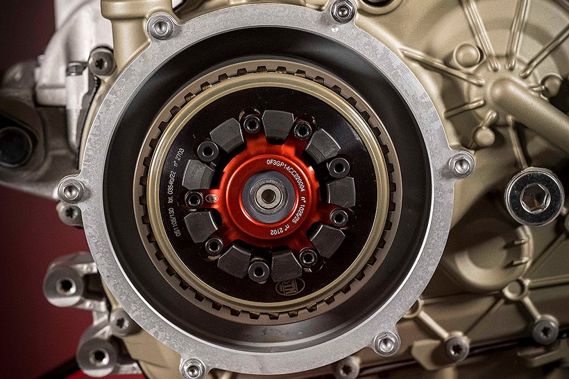Der Desmosedici Stradale R-Motor ist mit einer Trockenkupplung ausgestattet, die aus der Entwicklung der vom offiziellen Ducati-Team in der WorldSBK eingesetzten Version stammt.…