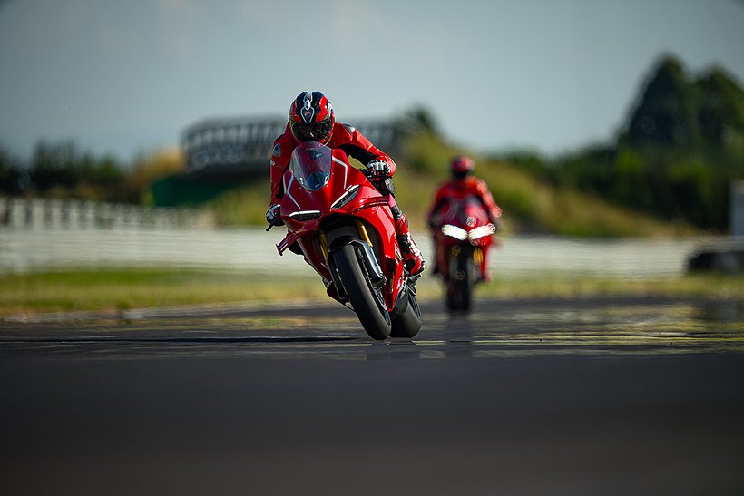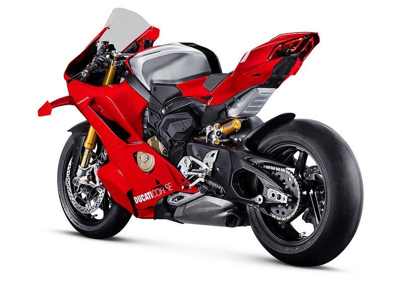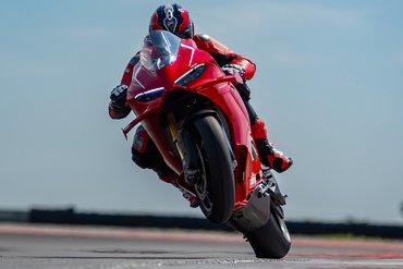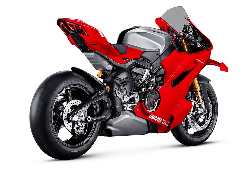 Das Herzstück der Panigale V4 R ist der kompakte 998 cm³ Desmosedici Stradale R-Motor, der kompromisslos für den Einsatz in der Superbike-Weltmeisterschaft entwickelt wurde – ein echtes Racing-Triebwerk mit desmodromischer Ventilsteuerung, gegenläufiger Kurbelwelle und Twin-Pulse-Zündfolge. Das Layout des 90°-V4 ist um 42° nach hinten geneigt, entspricht dem der MotoGP-Bikes, macht den Motor kompakt, ermöglicht die Zentrierung der Massen und eine hervorragende Integration ins Motorrad. Er verfügt über zahlreiche technische Lösungen aus dem Rennsport – darunter gebohrte Titanpleuel, DLC-beschichtete Kolbenhemden, eine kompakte SBK-Trockenkupplung sowie die gleichen Übersetzungsverhältnisse wie bei beim Panigale V4 Superbike für den ersten, zweiten und sechsten Gang. Die Höchstdrehzahl beträgt 16.500 U/min im sechsten Gang. Die maximale Leistung liegt bei 218 PS in Euro-5+-Konfiguration und steigt in der Racing-Konfiguration mit Akrapovic-Auspuffanlage und Shell Performance Öl auf 239 PS – echtes Racing-Niveau. Das Drehmoment konnte im Vergleich zur Vorgängerversion bei 6.000 U/min um 7% gesteigert werden. Diese Werte sind das Ergebnis der großartigen Arbeit der Ducati-Ingenieure, die die neue Panigale V4 R Euro-5+-konform gemacht haben, ohne das Ziel maximaler Performance für die Rennstrecke aus den Augen zu verlieren. Die Panigale V4 R erreicht eine Höchstgeschwindigkeit von 318,4 km/h – in Racing-Konfiguration sogar 330,6 km/h. Bis vor Kurzem war diese Geschwindigkeit ausschließlich MotoGP-Bikes vorbehalten.