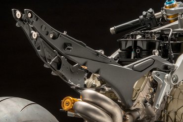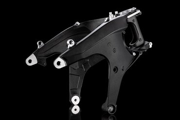 Ein weiterer Vorteil des Front-Frame-Konzepts ist, dass die seitlichen Rahmenelemente deutlich kürzer sind, was ein kompakteres und schlankeres Layout ermöglicht. Der Hauptrahmen wird durch einen leichten, aus Magnesium gefertigten vorderen Rahmen ergänzt, der auch die Instrumente und den Scheinwerfer trägt. Zudem kommt ein Heckrahmen zum Einsatz, der im Aluminium-Kokillenguss-Verfahren hergestellt wird und am Hauptrahmen sowie am hinteren Zylinderkopf befestigt ist.