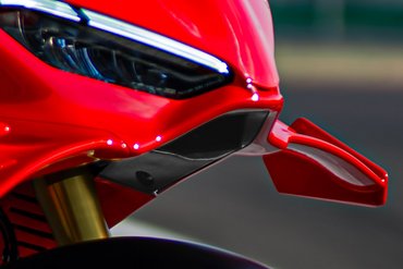 Die Aerodynamik der Panigale V4 R erreicht mit den erstmals bei einem homologierten Motorrad eingesetzten Corner Sidepods ein neues Niveau. Ducati Corse, das 2021 als erstes MotoGP-Team diese Technologie eingeführt hat, überträgt damit modernste Rennsportlösungen auf die Straße. Präzise Analysen auf dem Simulator in den verschiedenen Fahrphasen (Geradeausfahrt, Bremsen, Kurvenmitte, Beschleunigungsphase) haben gezeigt, dass der aerodynamische Einfluss auf die Rundenzeiten in Kurven höher ist als auf der Geraden. Im Gegensatz zu Winglets, die am effektivsten sind, wenn das Motorrad aufrecht steht, entfalten Corner Sidepods ihre Wirkung in Schräglage, wenn sich das Motorrad näher am Boden befindet. Der entstehende sogenannte „Ground Effect“ erzeugt durch den Luftstrom einen Unterdruck, der Abtrieb zur Folge hat – also eine vertikale Kraft, die den Reifengrip in der Kurvenmitte erhöht und damit höhere Geschwindigkeiten sowie in der Folge bessere Rundenzeiten ermöglicht. Der Fahrer spürt diesen Effekt deutlich: Am Scheitelpunkt der Kurve zieht das Motorrad in Schräglage spürbar nach innen, sodass sich die Linie ohne zusätzliche Korrekturen von selbst schließt – für eine engere Linienführung und höhere Kurvengeschwindigkeit. Auf Geraden hingegen bleibt die Wirkung aus, da die Sidepods im Windschatten des Vorderrads liegen.