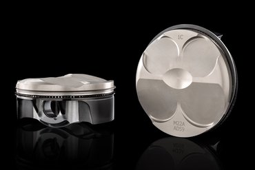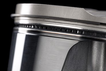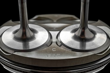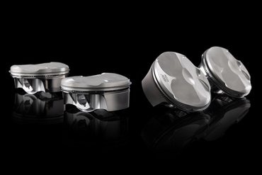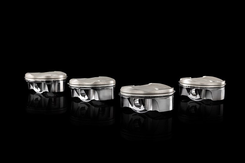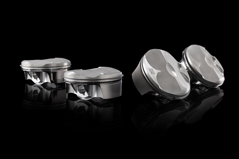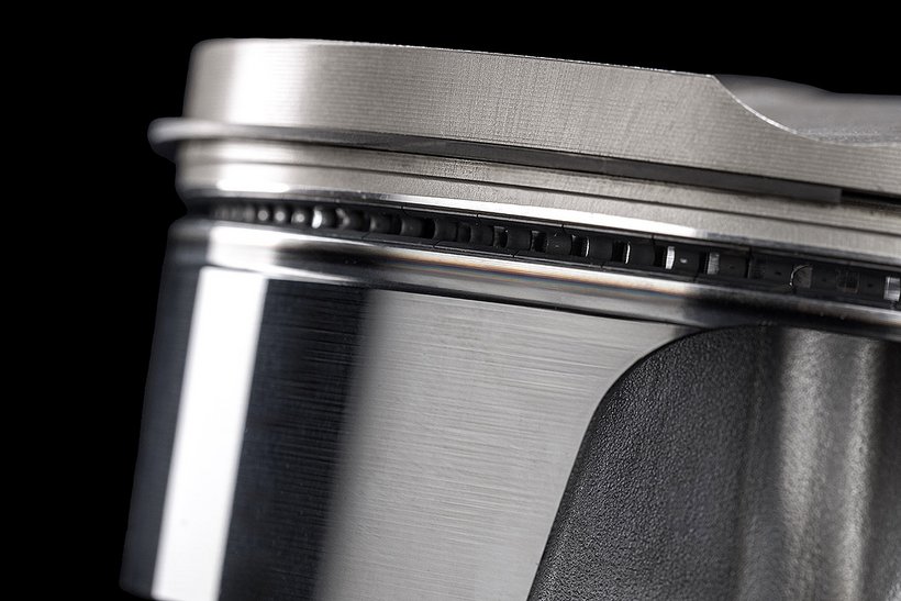 Das horizontal geteilte Leichtmetall-Motorgehäuse ist im Kokillengussverfahren gefertigt. Das obere Kurbelgehäuse beherbergt vier Aluminium-Zylinderlaufbuchsen, deren Nikasil-Beschichtung Verschleiß und Reibung minimiert. Die 81 mm großen Kolben aus gegossenem Aluminium – in der Panigale V4 R 7G nochmals 10 Gramm leichter – sind mit nur einem Kompressionsring und einem Ölabstreifring versehen und nach der „Box-in-Box“-Technologie konstruiert. Dabei wurde besonders auf die Kolbenhemdhöhe und die Materialstärke im Unterbodenbereich geachtet, um Verschleiß und Massenträgheitskräfte zu reduzieren, ohne die notwendige Steifigkeit und Festigkeit zu beeinträchtigen. Zusätzlich ist der Kolben mit einer DLC-Oberflächenbehandlung (Diamond-Like Carbon) versehen, um die Reibung zwischen Kolben und Laufbuchse weiter zu verringern. Die durch diese Strukturoptimierung erreichte Gewichtsreduktion um 5,1 % – ein bemerkenswerter Wert, wenn man die ohnehin schon geringe Masse der Kolben der vorherigen Generation (195 g) berücksichtigt – reduziert die oszillierenden Massen und verringert die Trägheitskräfte im Kurbeltrieb. Das Ergebnis: höhere Zuverlässigkeit und gesteigerte Performance.