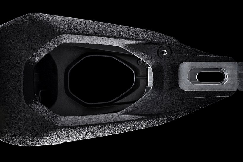 Der Tank aus gebürstetem Aluminium fasst 17 Liter, und wie bei den MotoGP-Bikes ist ein Teil des Kraftstoffs unter den Fahrersitz verlagert. Im dadurch frei gewordenen Raum im…