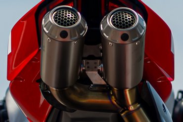 Ducati Performance hat in Zusammenarbeit mit Akrapovič eine vollständig aus Titan gefertigte Auspuffanlage für die Panigale V4 R entwickelt, die über einen doppelten Schalldämpfer unter dem Sitz und Carbon-Hitzeschilde verfügt. Die Anlage verbessert das Leistungsgewicht der Panigale V4 R dank einer Gewichtsersparnis von 6,6 kg gegenüber dem Standardsystem und sorgt für eine Leistungssteigerung von 17 PS auf 235 PS. Der Geräuschpegel beträgt 105 dB, kann jedoch mit dem optionalen DB-Killer auf 102 dB reduziert werden.