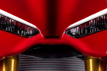 Wie bei allen „R-Modellen“ aus Bologna setzt auch die Panigale V4 R auf die kompromisslose Rennsport-Seele, die diese Motorräder seit jeher in der WorldSBK auszeichnet. Das klassische Ducati-Rot der Verkleidung steht in starkem Kontrast zum schwarz lackierten Rahmen und der Einarmschwinge. Der aus gebürstetem Aluminium gefertigte Tank verleiht der V4 R zusätzlich eine aggressive, technisch-puristische Note. Kompakte Proportionen, scharfe Linien und modernste, aus der Aerodynamikforschung abgeleitete Lösungen verschmelzen zu einer ebenso radikalen wie eleganten Ästhetik. Gebaut, um Grenzen neu zu definieren.