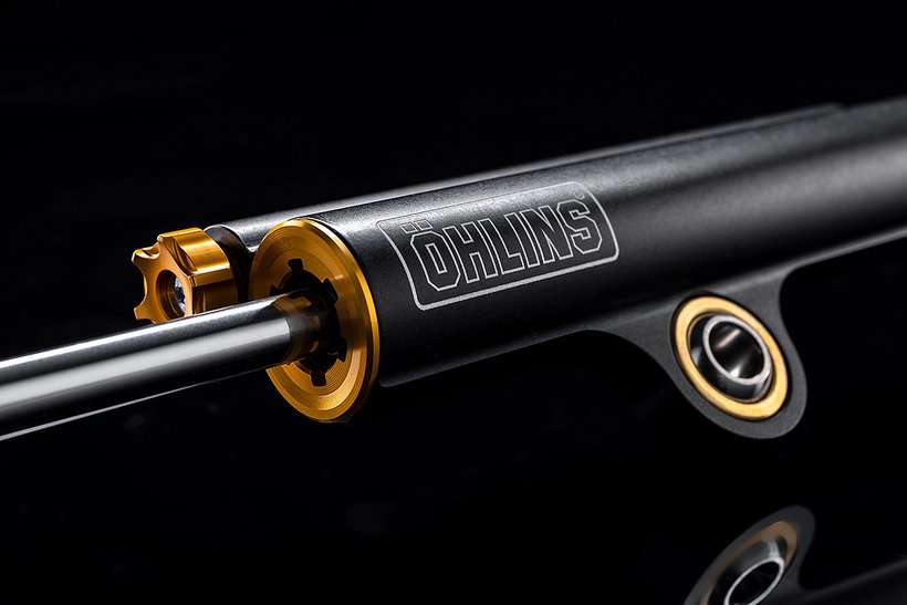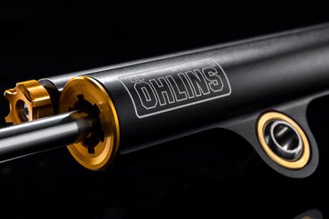Die Panigale V4 R ist das erste Motorrad, das mit dem neuen Öhlins SD20-Lenkungsdämpfer ausgestattet ist. Dieser zeichnet sich durch ein kompakteres Design aus und bietet dank eines größeren Kolbendurchmessers einen erweiterten Einstellbereich, kürzere Reaktionszeiten und eine höhere Dämpfungskraft. Selbst wenn das Vorderrad aufgrund der brachialen Leistung zeitweise den Bodenkontakt verliert, verhindert der Lenkungsdämpfer Unruhe im Fahrwerk.