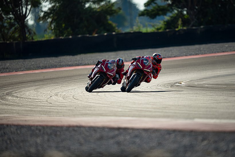 Die neue Panigale V4 R geht in Sachen Bremsleistung noch einen Schritt weiter. Wie die Panigale V4 7G ist auch die neue Panigale V4 R mit dem fortschrittlichen Bosch Cornering-ABS mit „Electronic Combined Brake System“ (eCBS) ausgestattet, bei dem die Betätigung der Vorderradbremse – abhängig von den ABS-Einstellungen – automatisch Bremsdruck auf das Hinterrad ausübt. Die Bremskraft hängt vom Druck auf die Vorderradbremse und dem maximal zulässigen Schlupfwert des Hinterrads ab. Je nach Einstellungsstufe variiert die Bremskraft der Hinterradbremse: von durchschnittlich 7,5 % der auf die Vorderradbremse angewandten Bremskraft im Straßenmodus bis zu 15,5 % für das höchste Leistungsniveau, das für die Rennstrecke vorgesehen ist. Die Control-Strategie ermöglicht im Vergleich zur Panigale V4 7G eine noch stärkere Nutzung der Hinterradbremse. Dies wird durch eine noch präzisere Berechnung der Schlupf- und Rollwinkel erreicht, sodass die Bremsleistung am Hinterrad weiter gesteigert wird. So kann der Fahrer noch später bremsen, da das System in der Lage ist, in der letzten Phase der Kurveneinfahrt bis fast zum Blockieren des Hinterrads zu verzögern – wie es sonst nur ein professioneller Fahrer vermag. Das Race eCBS-System bietet mehrere Stufen, die auf unterschiedliche Einsatzbedingungen und Fahrerpräferenzen abgestimmt sind. Stufen 1 bis 5 sind für den Einsatz auf der Rennstrecke bei trockenem Asphalt konzipiert. Stufe 6 ist für trockene Straßenbedingungen gedacht, während Stufe 7 für nasse Bedingungen optimiert ist. Der TrackPlus-Modus, verfügbar ab Stufe 1, ist für „Time Attack“-Sitzungen ausgelegt. Dieser Modus nutzt die maximale Bremskraft der Hinterradbremse und aktiviert die „Post Run“-Funktion. In Bremsphasen wird die Hinterradbremse gezielt eingesetzt, um die Frontlastigkeit zu reduzieren und die Stabilität zu erhöhen. In der Kurvenmitte hält die „Post Run“-Strategie den Druck auf der Hinterradbremse für kurze Zeit aufrecht – selbst nachdem der Fahrer die Vorderradbremse gelöst hat. Das System simuliert das Manöver eines Profis, der das Bremspedal nutzt, um die Linie in der Kurve zu halten. So können auch ambitionierte Hobbypiloten professionelle Fahrtechniken nutzen, ohne die Hinterradbremse aktiv steuern zu müssen – und verbessern dadurch ihre Bremsperformance. Zusätzlich wird die Hinterradbremse auch in Rechtskurven aktiviert, in denen das Erreichen des Bremspedals erschwert sein kann. Der Track-Modus, verfügbar ab Stufe 3, unterscheidet sich von Stufe 1 durch eine geringere Bremsleistung am Hinterrad und deaktiviert die „Post Run“-Strategie des eCBS. Stufe 3 zeichnet sich zudem durch eine stärkere ABS-Intervention beim Bremsen auf gerader Strecke aus. Dieser Modus richtet sich an Fahrer, die ein Motorrad wünschen, das sich in Kurvenmitte sanfter verhält und einen weniger aggressiven Fahrstil unterstützt.