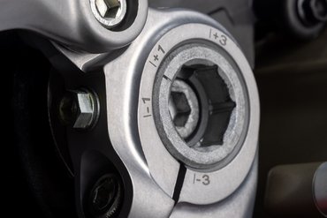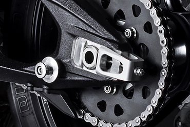 Die Schwinge der Panigale V4 7G ist mit monolithischen Kettenspannern ausgestattet – einer Technologie, die direkt aus der MotoGP stammt. Diese hochpräzisen Kettenspanner ermöglichen nicht nur eine schnelle und millimetergenaue Einstellung der Kettenspannung, sondern halten das Hinterrad auch beim Einbau exakt in Position. Das Rad selbst liegt dabei auf einer präzise gefrästen Führungsrille auf und bleibt auch ohne eingesetzte Achse an Ort und Stelle. Dadurch bleibt die Kettenspannung beim Reifenwechsel unverändert – ein Nachjustieren ist nicht erforderlich, da die Spanner automatisch wieder in die zuvor eingestellte Position zurückkehren. Der Radwechsel gestaltet sich dadurch genauso einfach und schnell wie bei einer Einarmschwinge – und lässt sich problemlos ohne fremde Hilfe durchführen. Der Kettenspanner auf der linken Seite besteht aus hochfestem, CNC-gefrästem Aluminium, um den Belastungen des Kettenzugs dauerhaft standzuhalten.